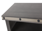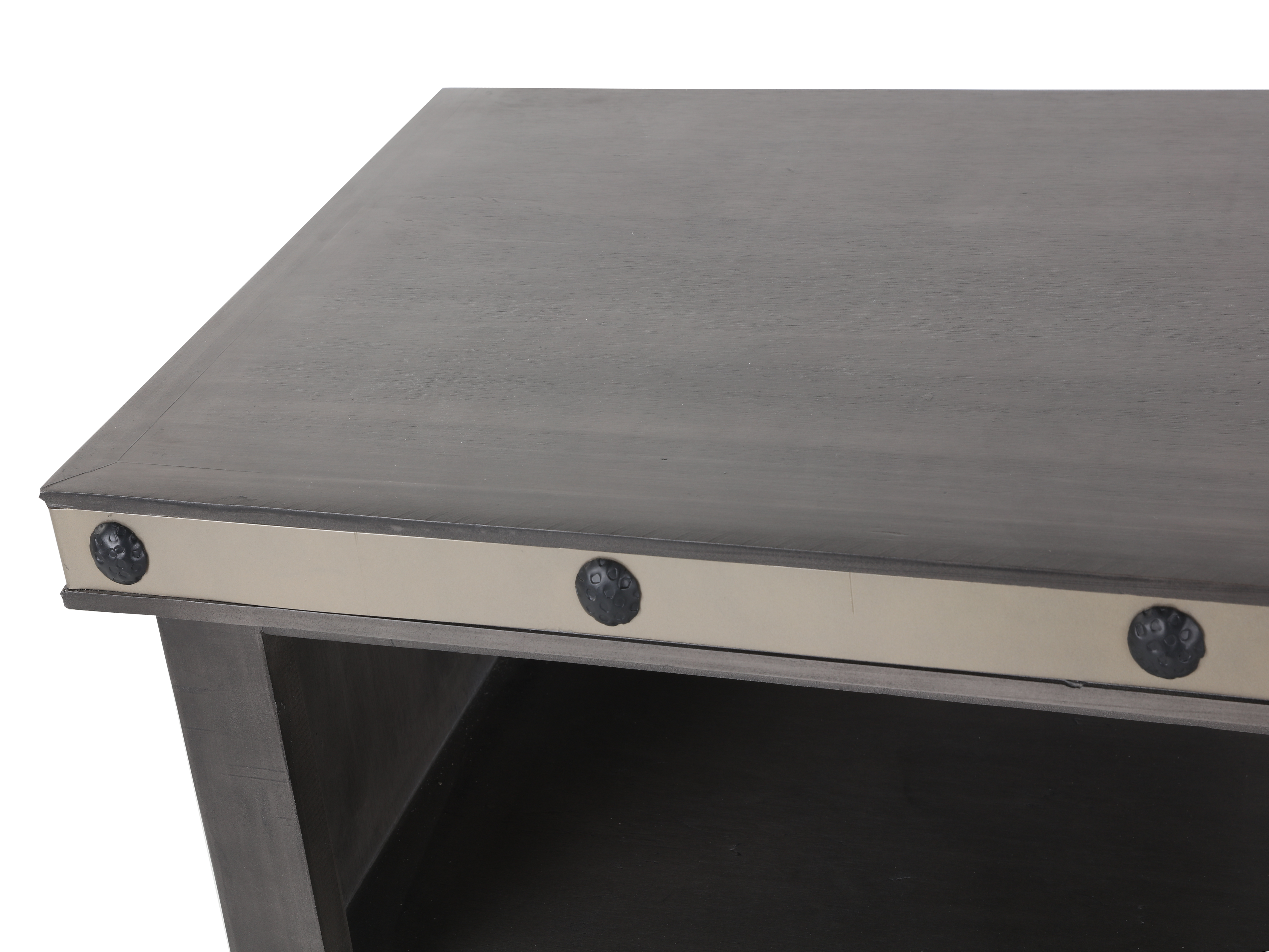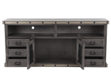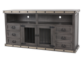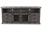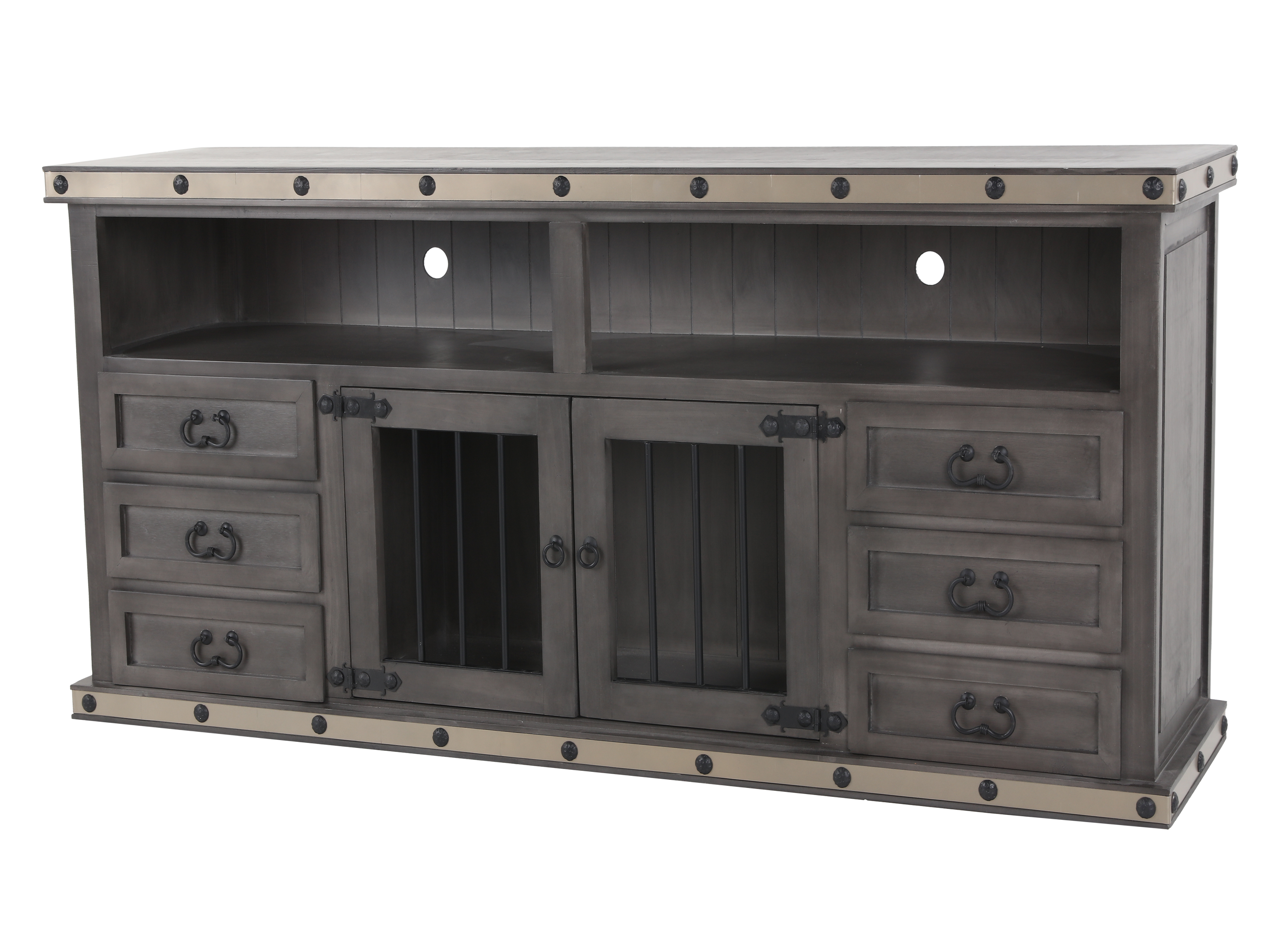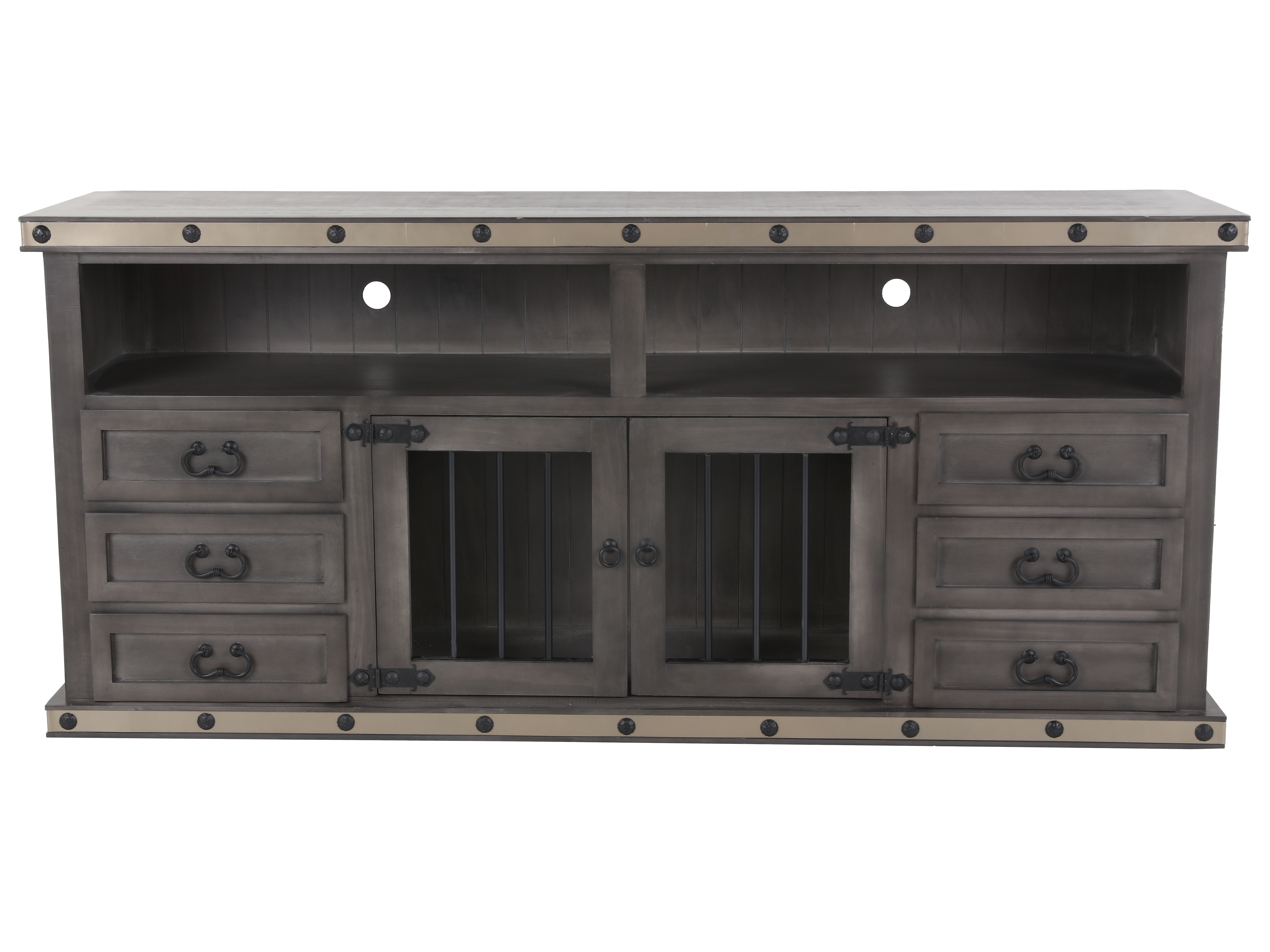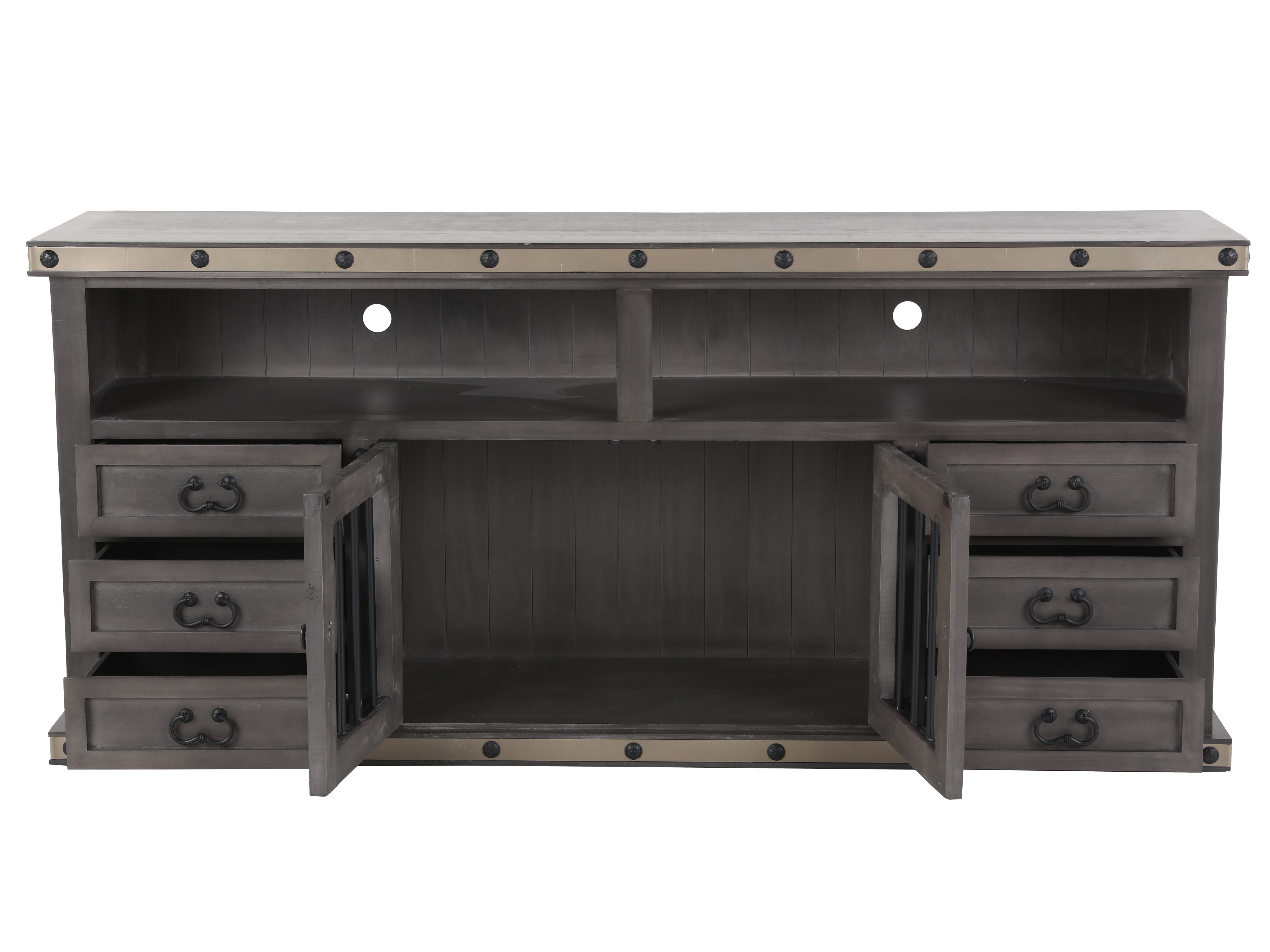 Elevate your entertainment space with this striking 80-inch TV stand, designed with a bold industrial aesthetic. Crafted from solid wood, it features metal trim with rivet accents for a rugged yet sophisticated look. The open shelving provides easy access to media components, while six spacious drawers offer concealed storage for accessories. A central cabinet with slatted metal doors enhances its rustic charm while ensuring organization. Thoughtfully designed with cable management cutouts, this TV stand seamlessly blends style and functionality, making it a perfect focal point for any modern or industrial-inspired living space.