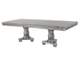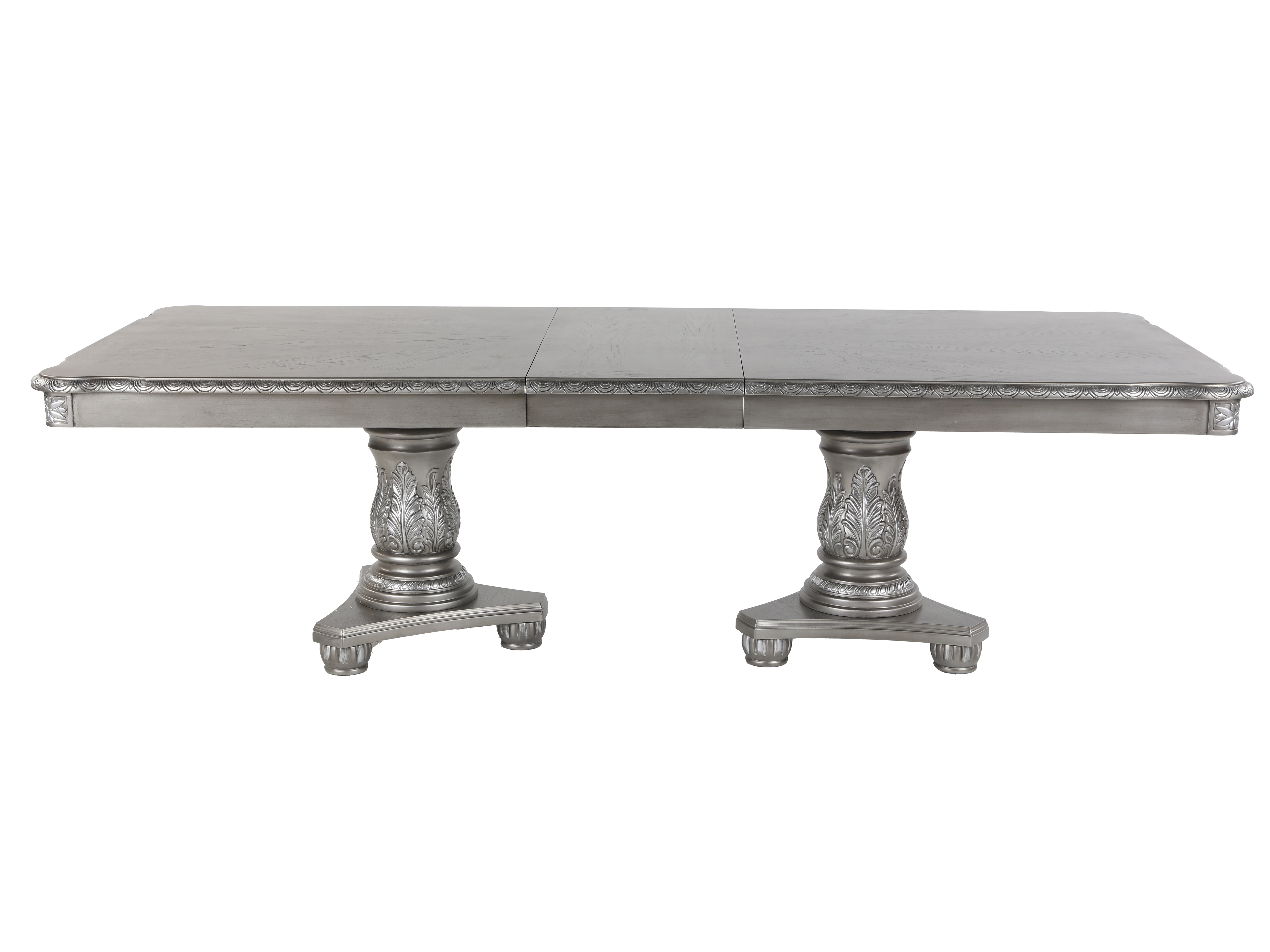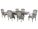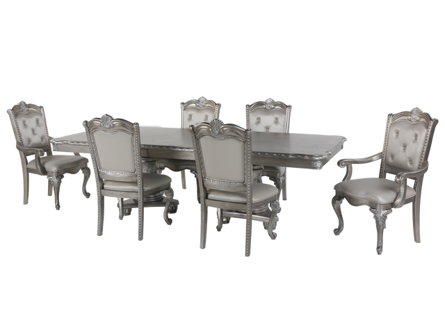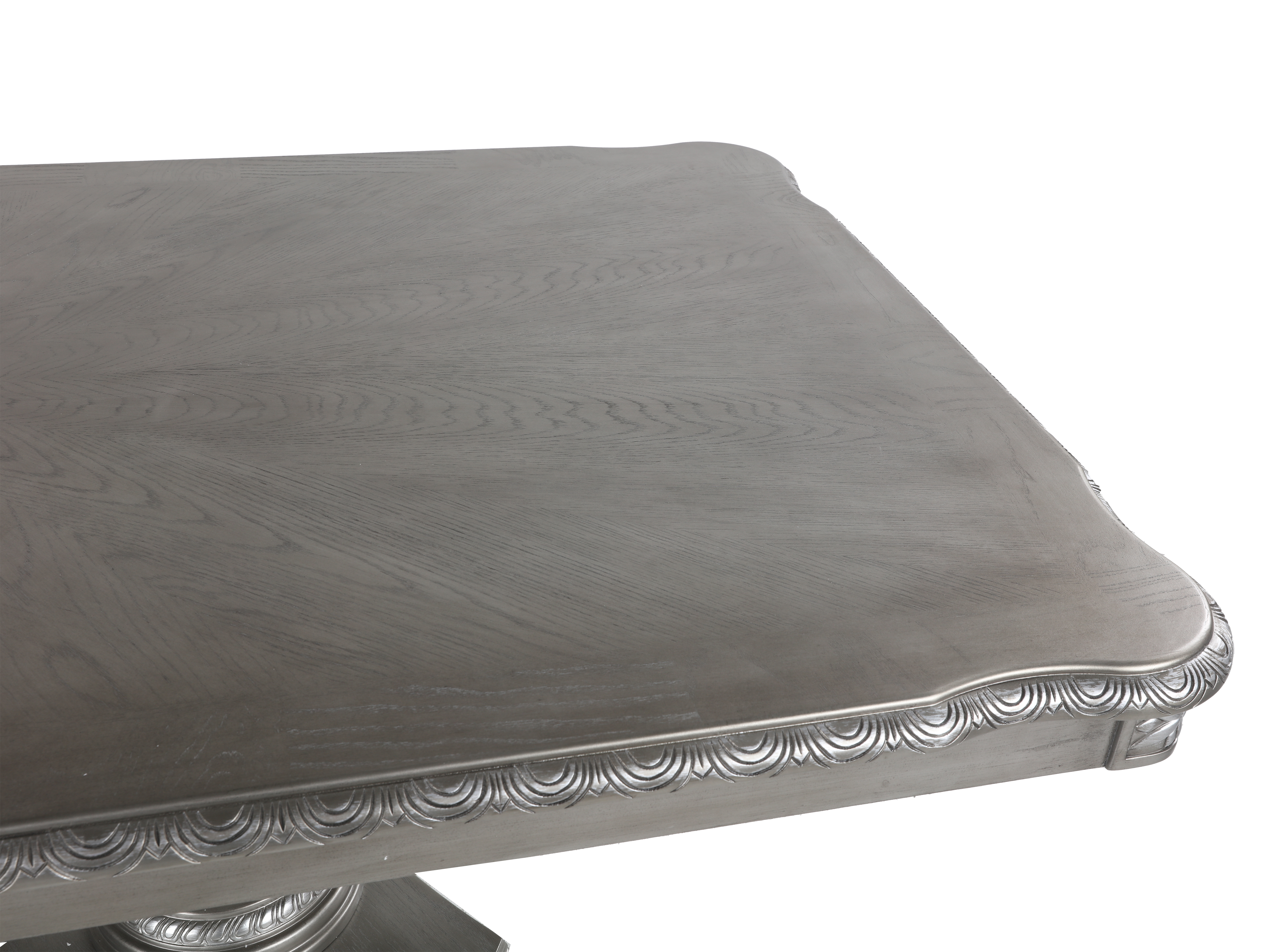 Elevate your dining experience with the Luxury Silver Dining Set, a perfect blend of elegance and sophistication. Crafted with exquisite detailing, this set features a grand rectangular dining table with an intricately carved pedestal base, exuding timeless charm. The smooth tabletop is accentuated with ornate trim, offering a refined space for gatherings and formal dinners.