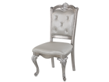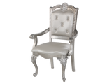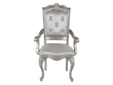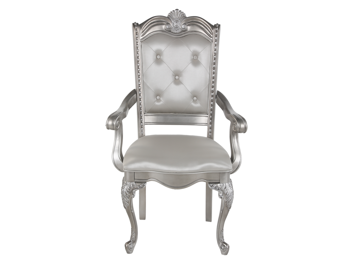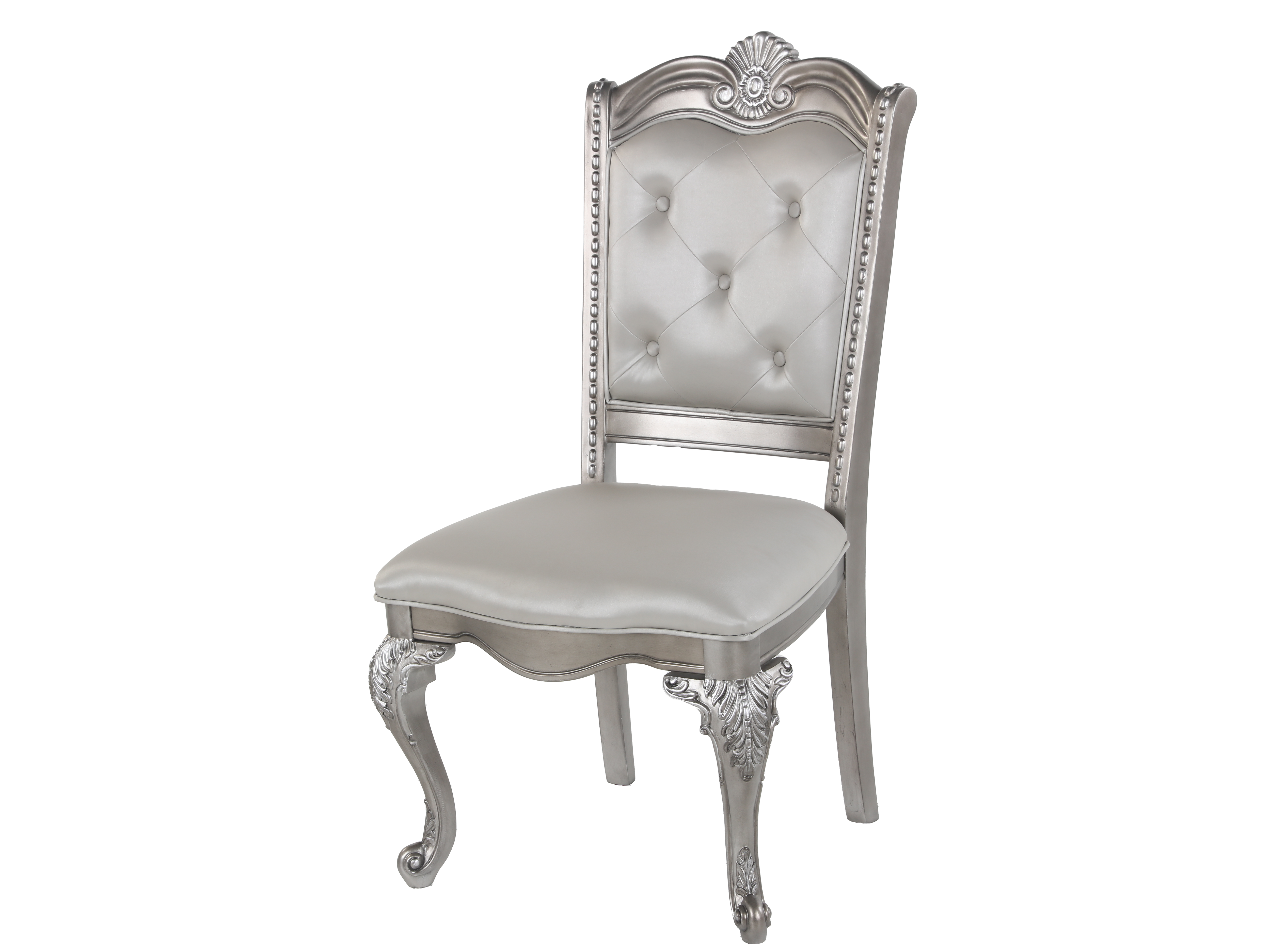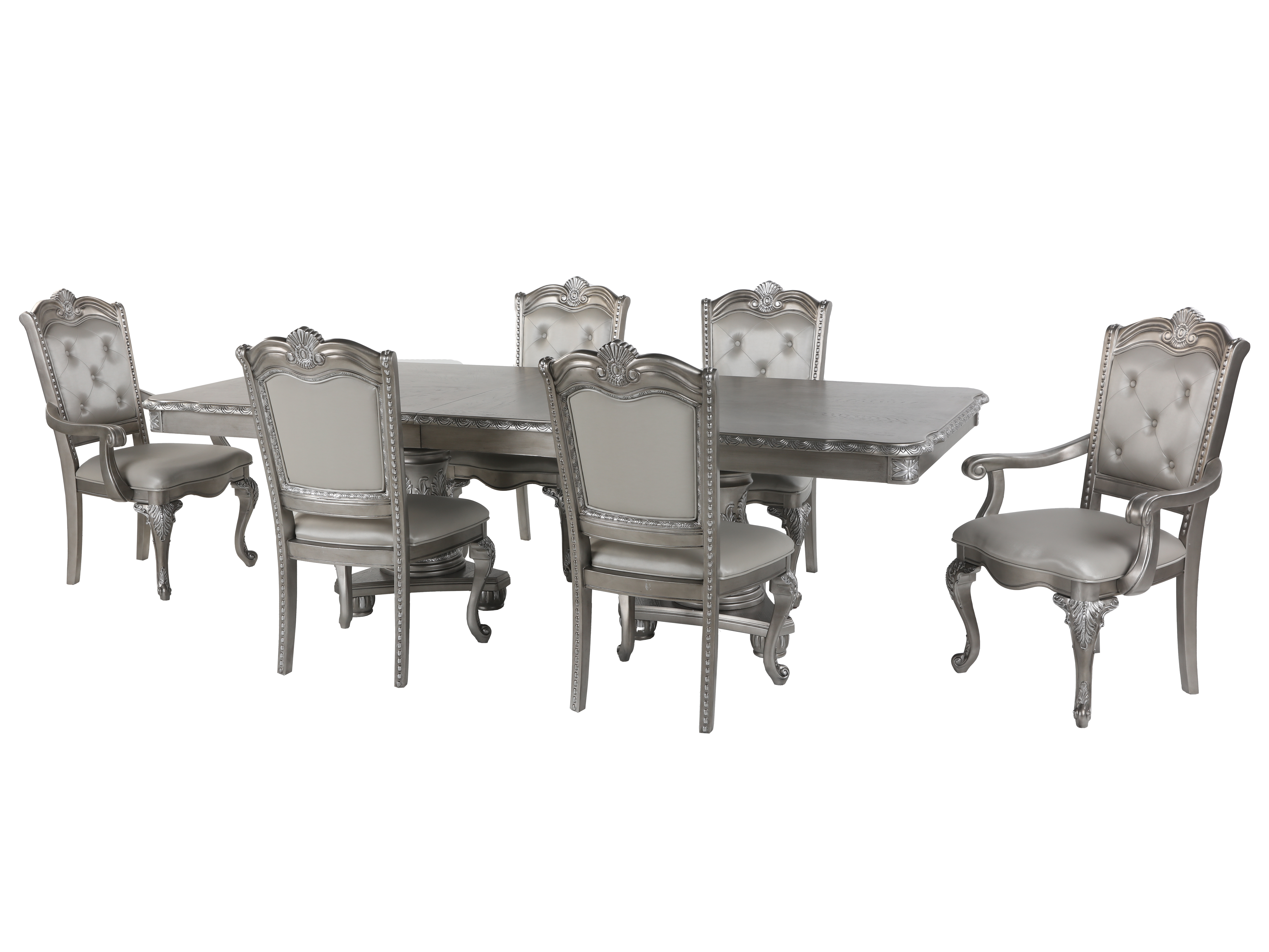 Included in the set are eight beautifully designed chairs—two armchairs and six side chairs—each upholstered in luxurious silver-tone faux leather. The tufted button detailing on the high backs, along with gracefully curved legs and carved embellishments, enhances the set’s opulent aesthetic while ensuring superior comfort.