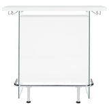 Elevate a multipurpose living room with this modern bar unit. a neutral finish, accented with polished chrome metal accents offers a striking design contrast. supported and flanked by clear tempered glass side panels, this bar unit boasts ultra-modern elements as well for a dramatic feel. compact yet highly functional, this bar unit also features ample storage space with six built-in open shelves for storing bottles, serving pieces and other mixologist must-haves. tucked beneath the bartop along each side is a stemware rack for wine glasses and more.