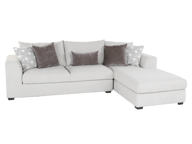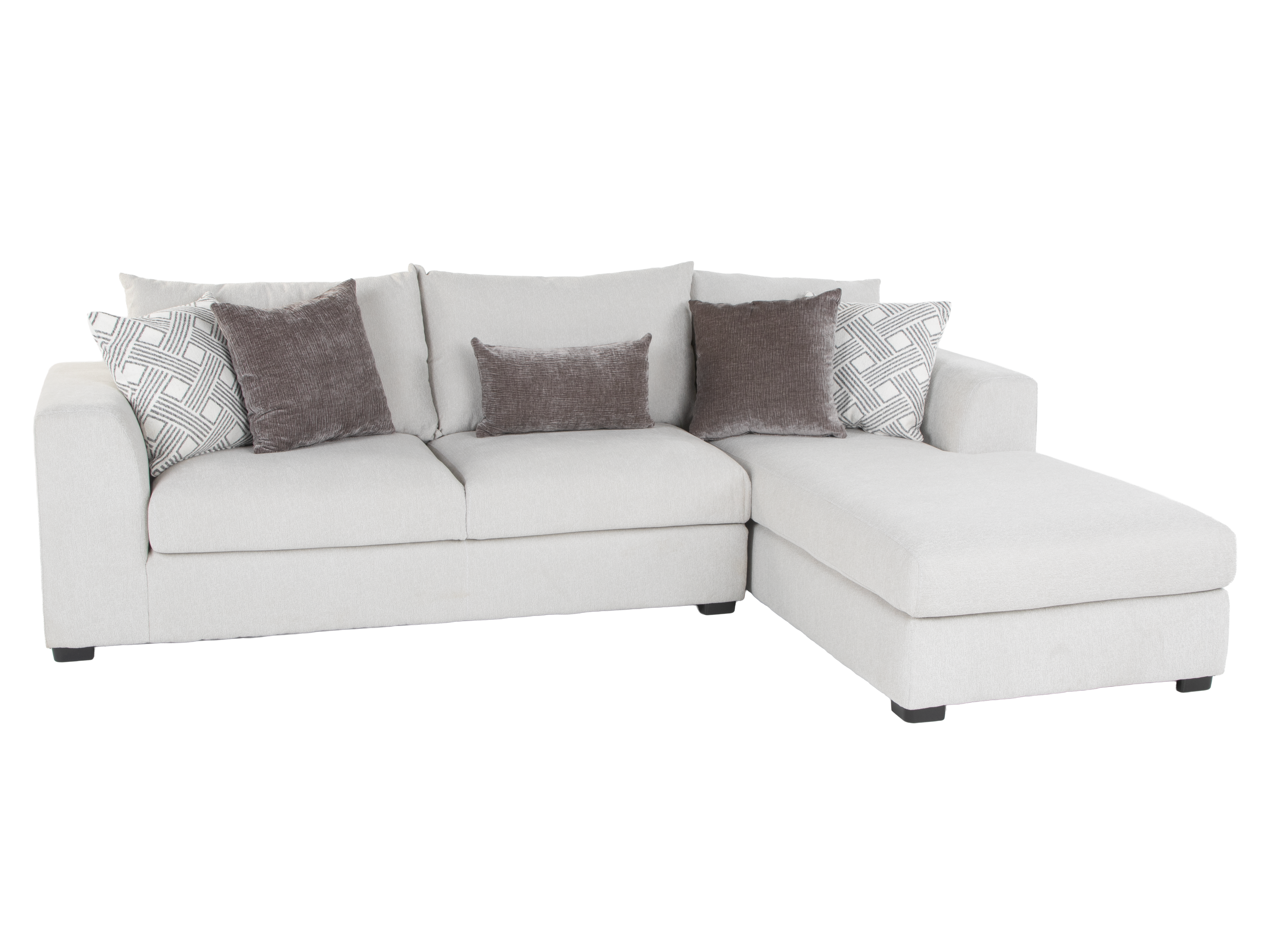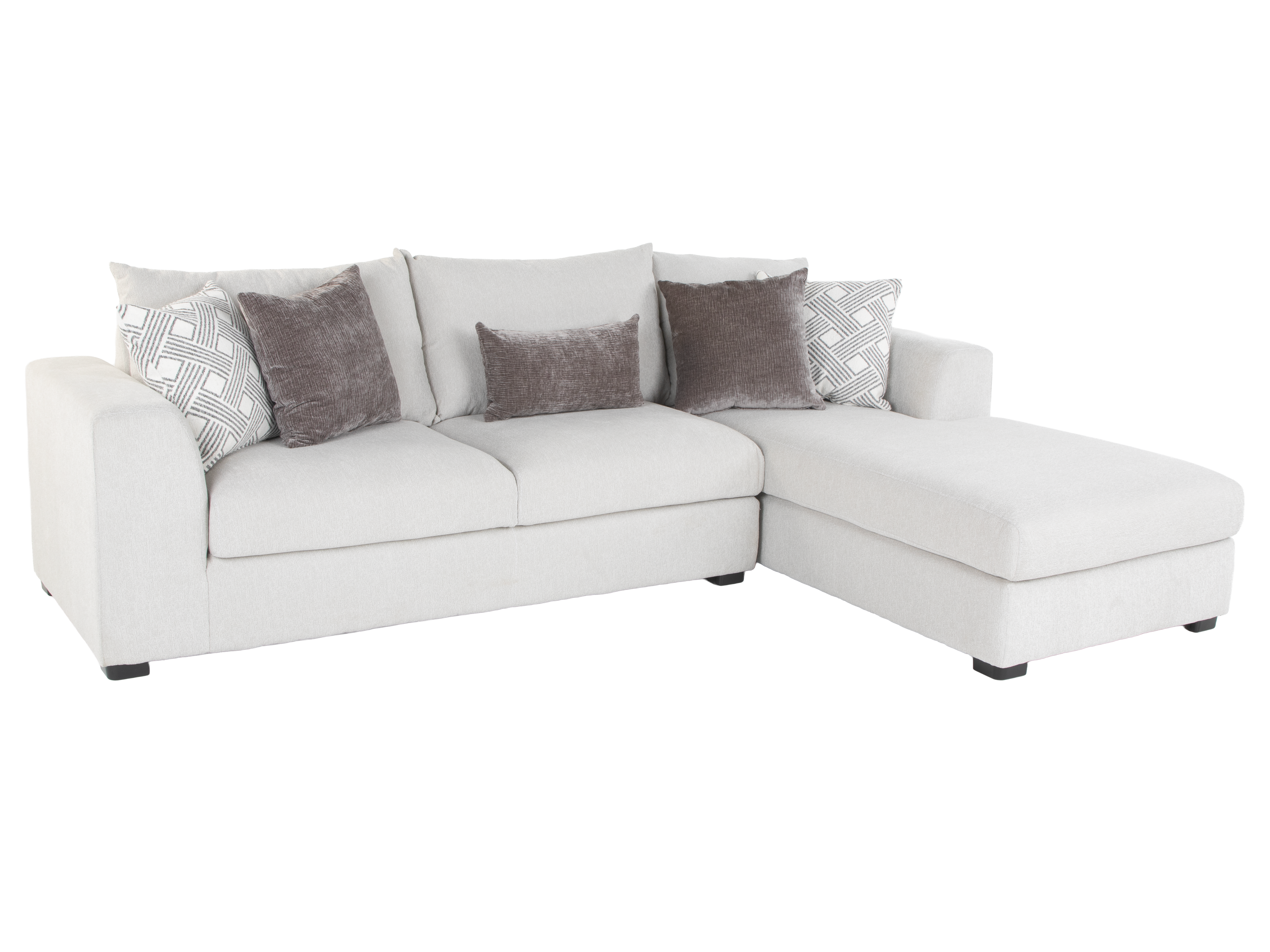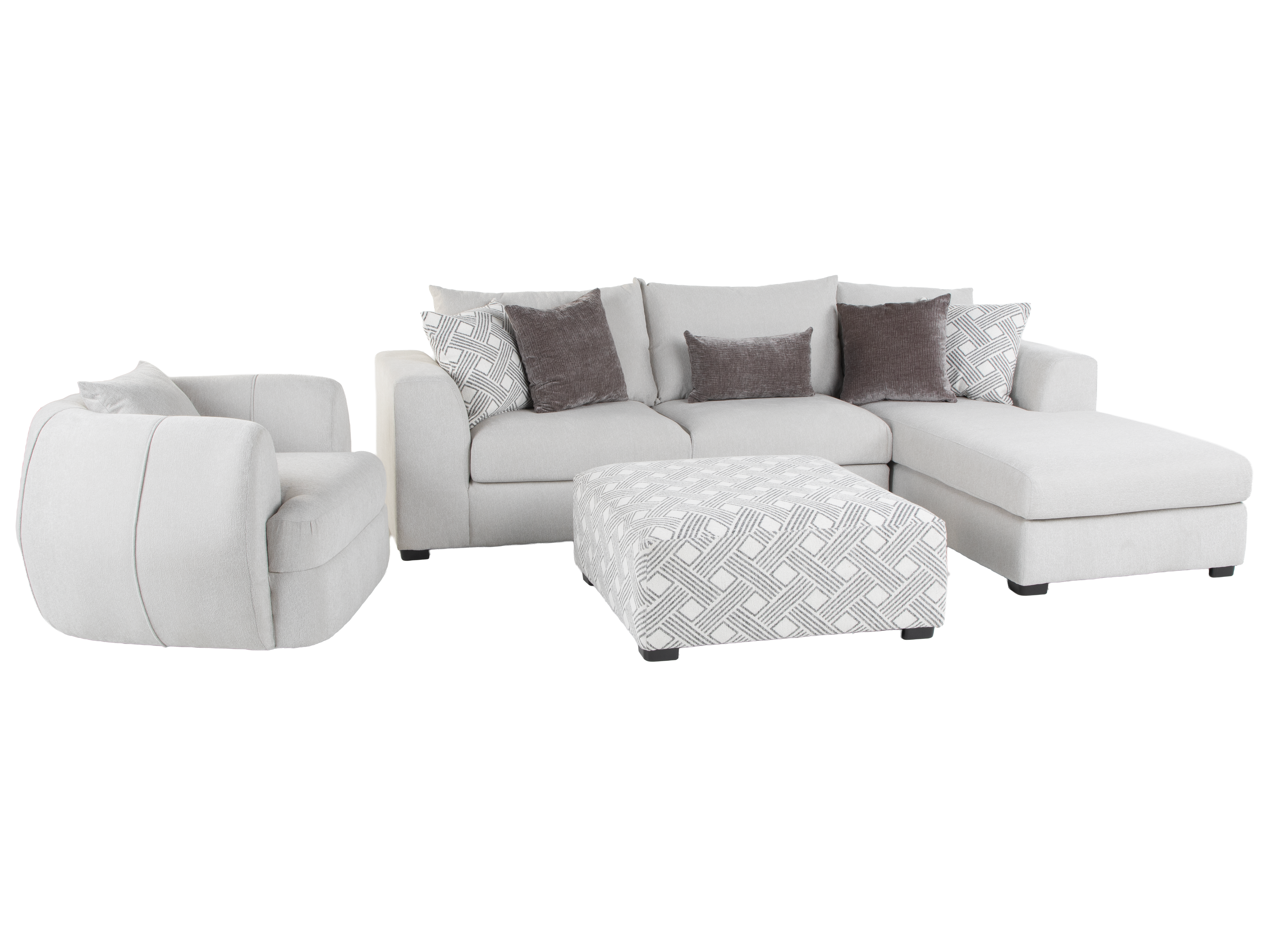 Brighten your living room with this modern, lounge-depth sectional in a soft light-silver woven fabric. Wide track arms, plush back cushions, and supportive seats keep the profile clean while dialing up everyday comfort. The right-facing chaise (on your right as you face the sofa) delivers full stretch-out space without crowding the room. Includes 4 accent pillows to layer in pattern and texture; the two small rectangular lumbar pillows shown are for photography and are not included. Coordinates with the matching swivel chair and patterned ottoman (sold separately) for a complete, designer-pulled look.