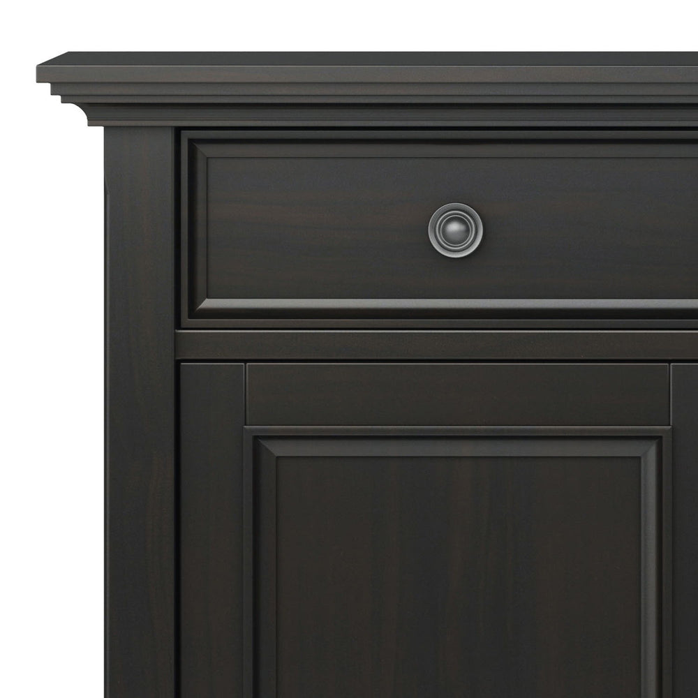 - Transitional Style includes tapered legs, molded crown edged tabletop, panel framed drawer fronts, metal drawer glides and antique bronze round decorative knobs