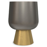 - Features a unique tulip shape with a round tabletop in an Antique Bronze finish and a base in an Antique Brass finish.