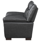 Bring modern comfort and sophistication to your seating area with this contemporary armchair. Upholstered in smooth grey leatherette with detailed stitching, it offers a clean, refined look. Generously padded seating and plush pillow-top arms provide exceptional comfort, while the high back delivers excellent support. Its sturdy wooden frame and dark brown block-style legs add lasting stability and a touch of contrast. Compact and stylish, this chair enhances any living room or lounge space with its modern design and inviting appeal.
