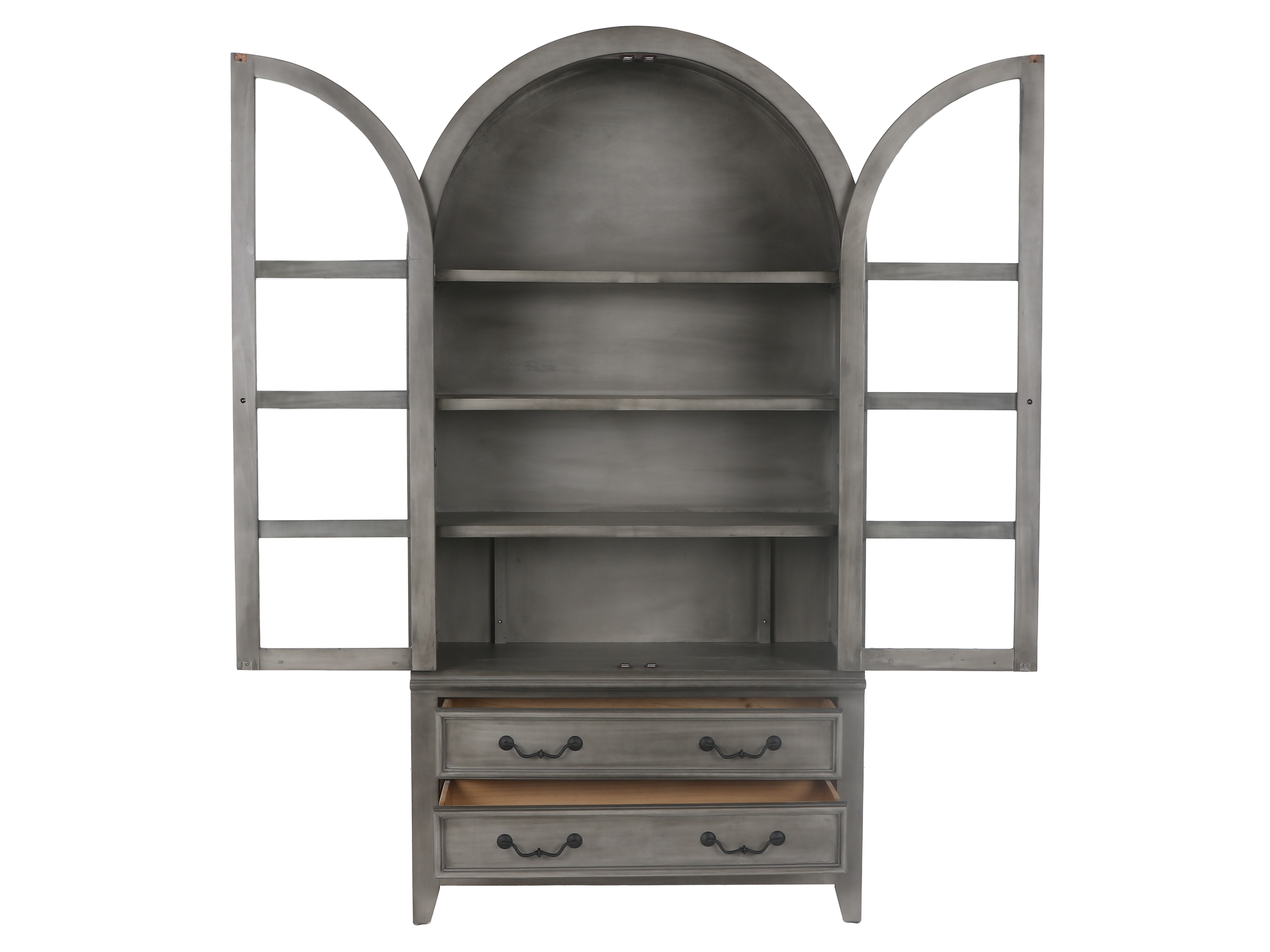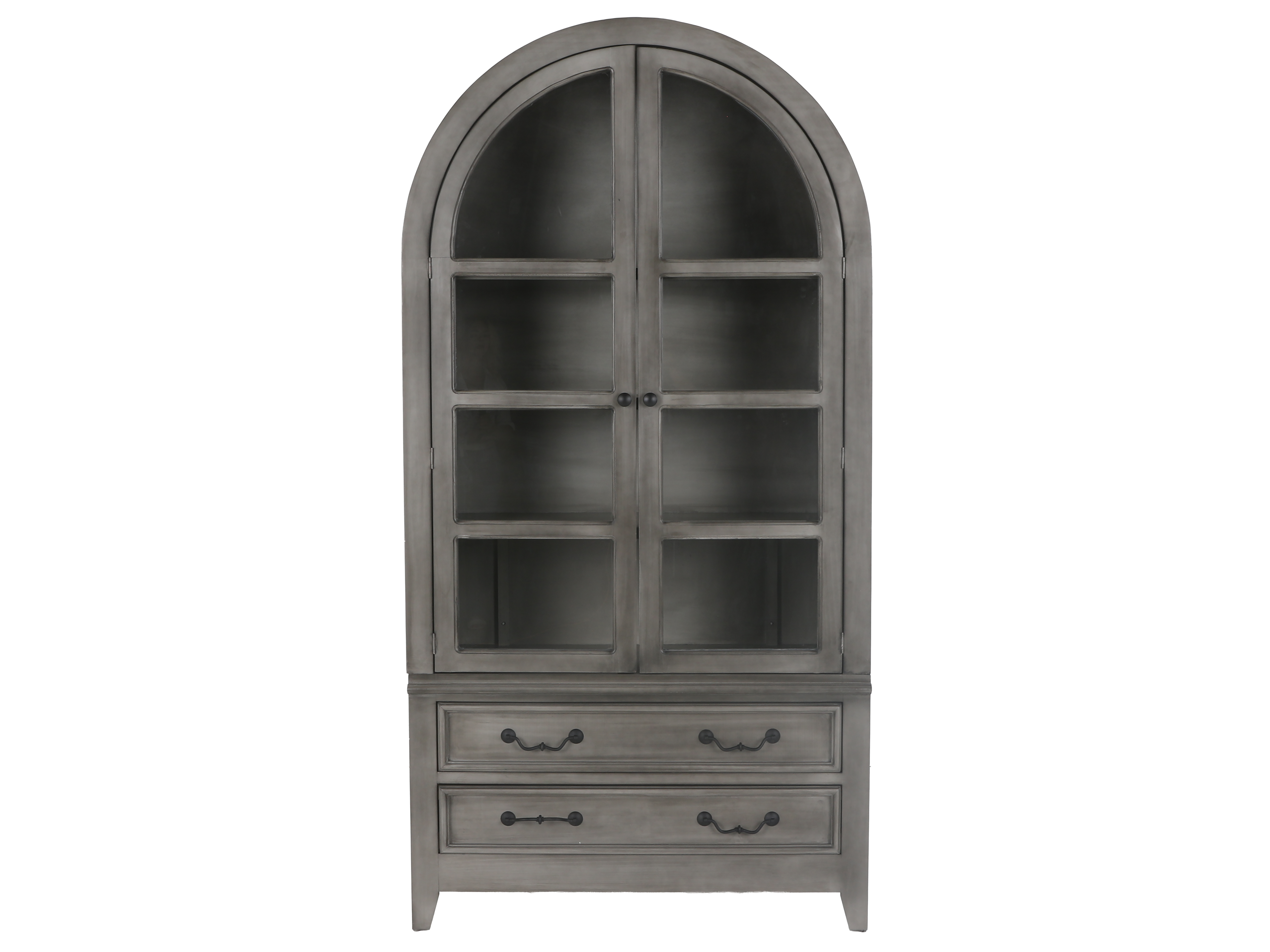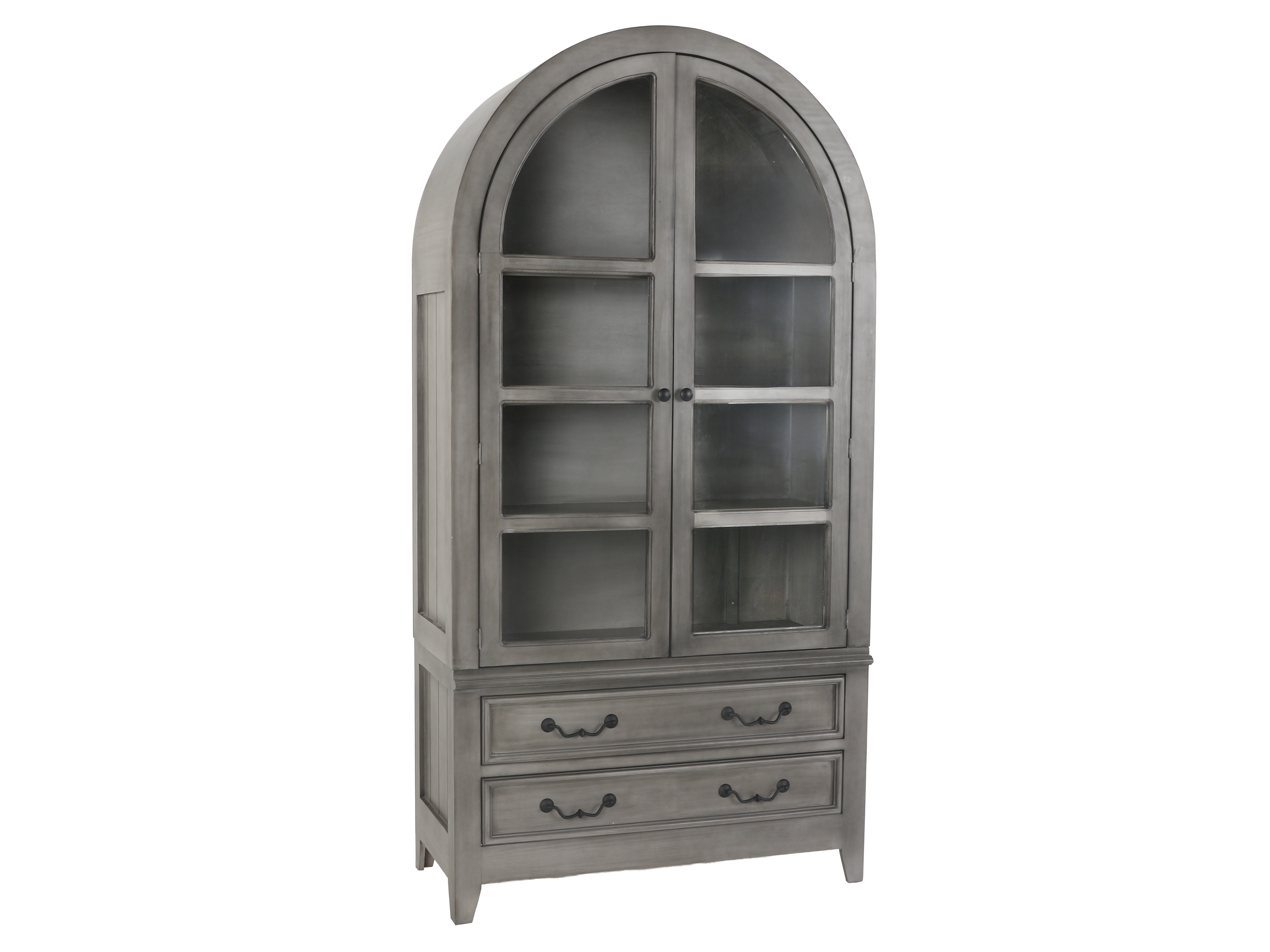 Arched Gray Display Cabinet with Glass Doors & Storage Drawers