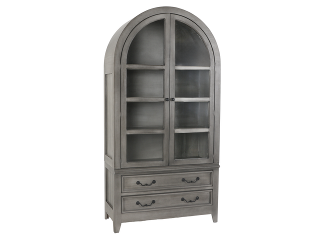 Showcase your collectibles in style with this elegant arched gray display cabinet. Featuring four spacious shelves behind framed glass doors, it offers the perfect view for your treasured items while keeping them dust-free. Two lower storage drawers provide additional space for linens, dinnerware, or everyday essentials. Crafted with a sophisticated arched top and a smooth gray finish, this cabinet blends timeless design with practical functionality—ideal for dining rooms, living areas, or home offices.
