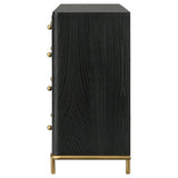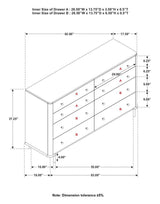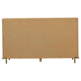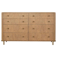 Create a focal wall and ample storage to your bedroom with this mid-century modern eight-drawer dresser, designed with a wire-brushed sand wash finished wood frame. Aged brass round knobs and slender legs offer a charming, metallic touch. Softly rounded corner edges and felt-lined top drawers present a finishing touch and thoughtful details.