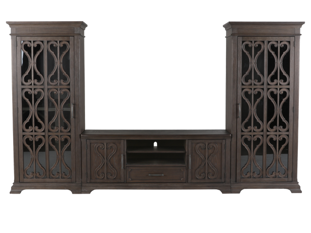 Immerse yourself in the sophisticated and alluring aesthetics of the Artesia 3-Piece Entertainment Center. This set is exquisitely designed with grandiose and intricate patterns that add a touch of class, finished in a natural grey shade. It consists of a TV console in the center, a left display cabinet, and a right display cabinet. The display cabinets feature a touch-light function and ample storage space to accommodate your entertainment gadgets or decorative items. The TV stand also features drawers, open storage, and storage with doors. Elevate any room into a plush and trendy area with this magnificent set.