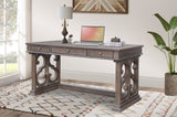 The desk is made from wood solids and veneers in a weathered brown/gray finish, with decorative scroll side panels and round metal knobs.