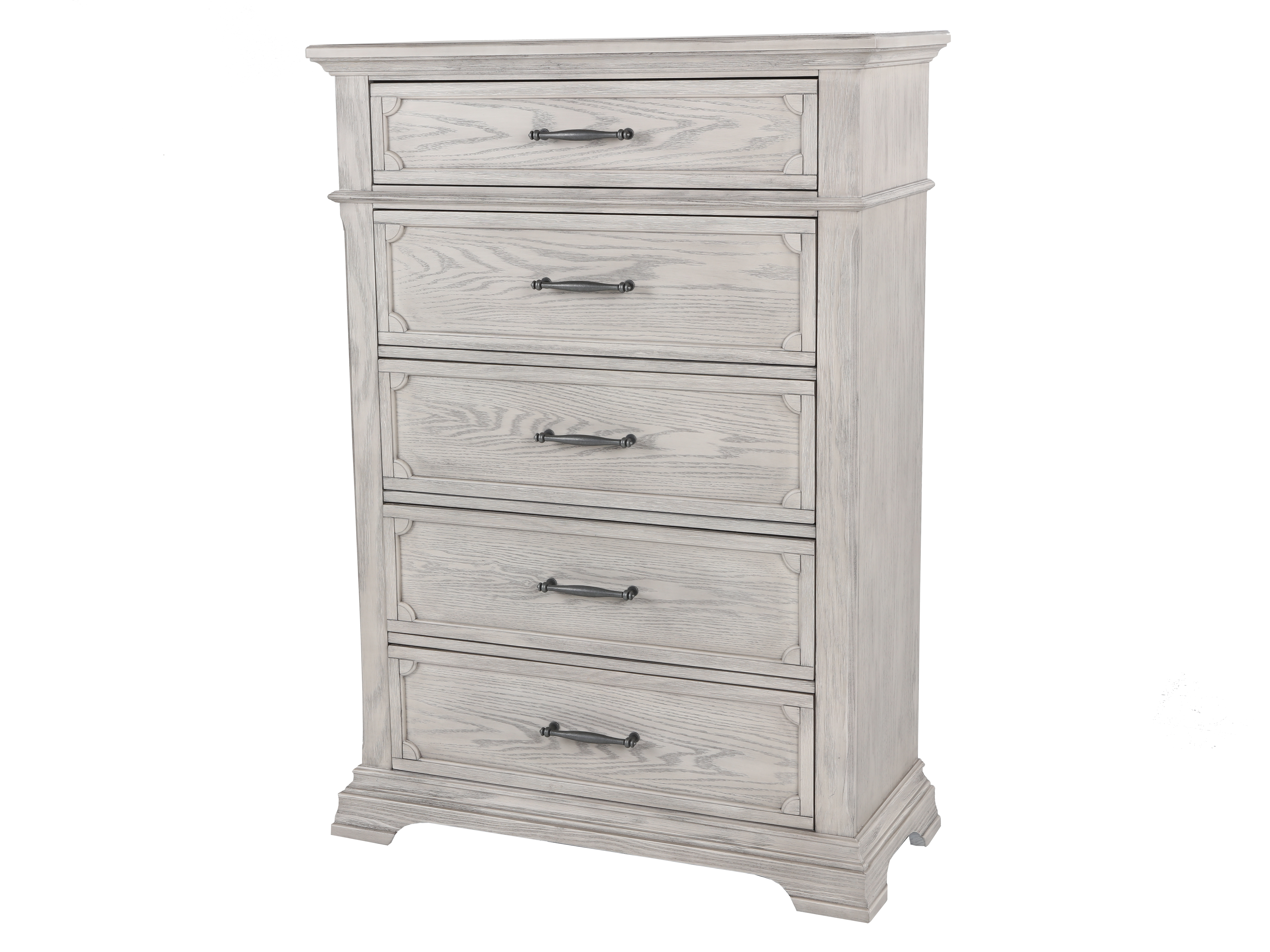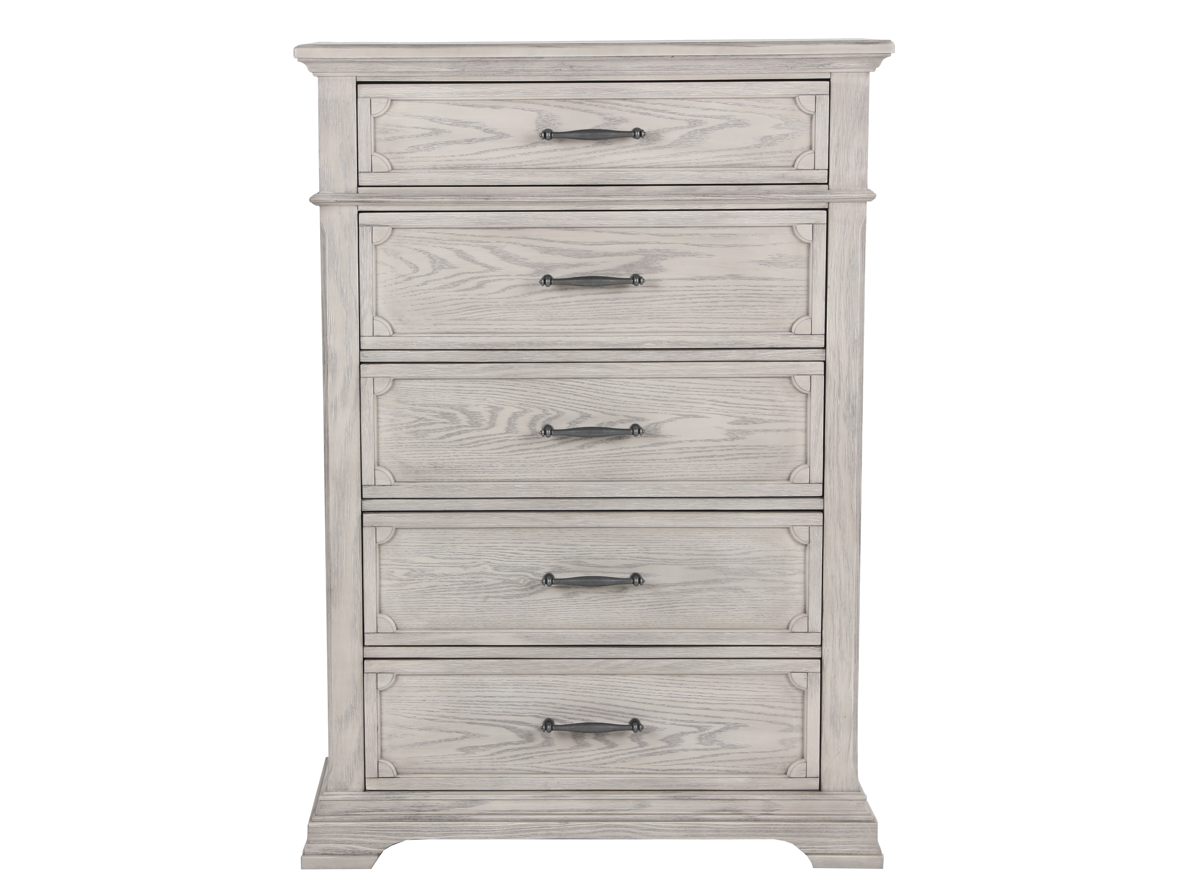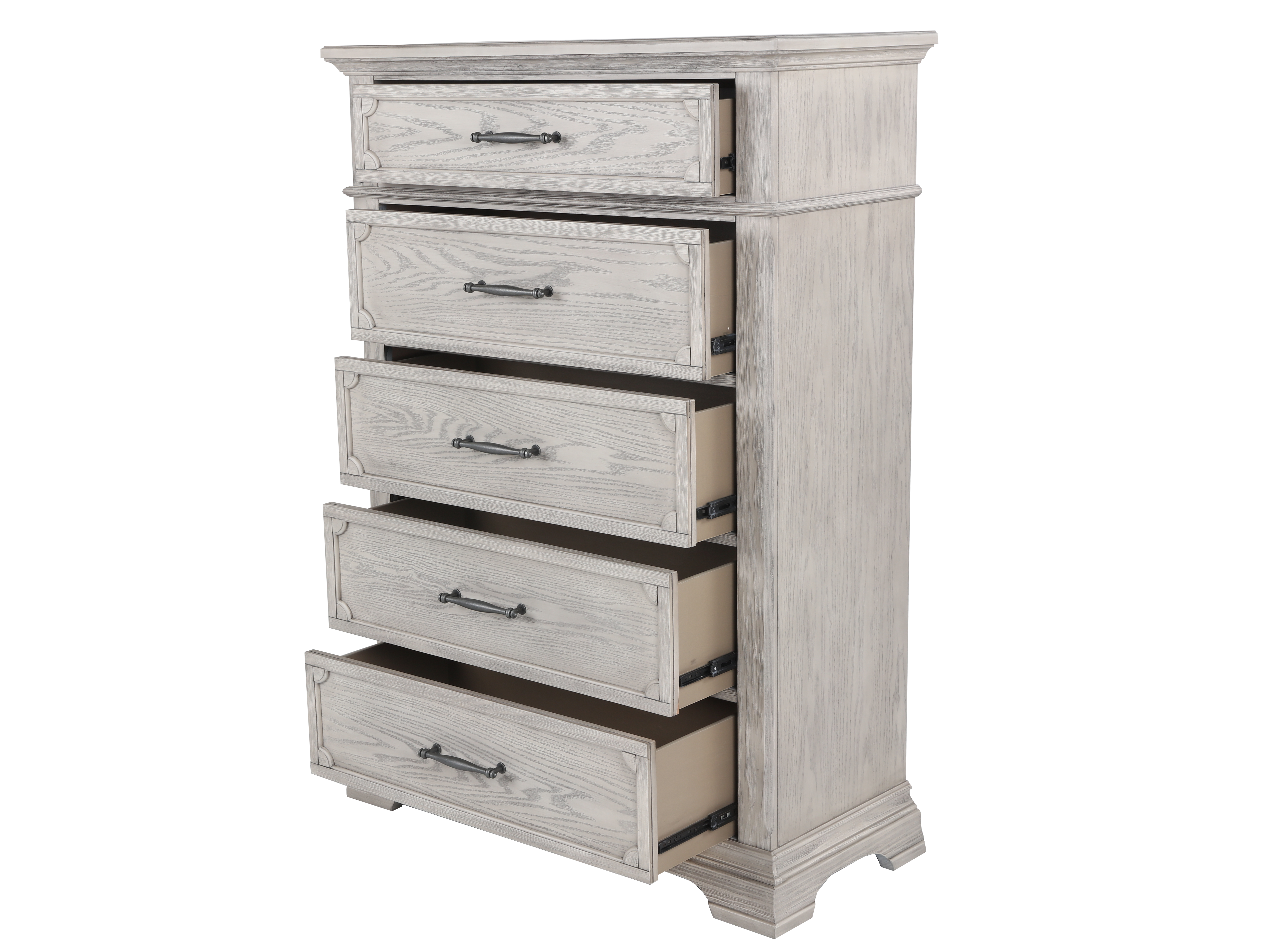 A tall, space-saving chest that delivers serious storage and classic detail. Five roomy drawers glide out fully for easy access, and the felt-lined top drawer keeps jewelry and small items protected. Built with dovetail joinery and sturdy materials for everyday use, it pairs perfectly with the matching bed, dresser, mirror, and nightstand.
