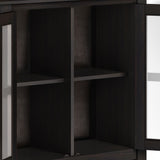 - Features 2 tempered glass doors that open to two adjustable shelves for versatile storage