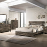 This bedroom collection embodies a rustic, yet minimalist aesthetic with its clean lines and neutral color palette. The set includes a low-profile bed frame, a dresser with a mirror, and a tall chest, all finished in a versatile finish that easily complements any decor. The sleek metal handles on the drawers add a touch of contemporary flair, while the large mirror reflects light, making the space feel brighter and more open.