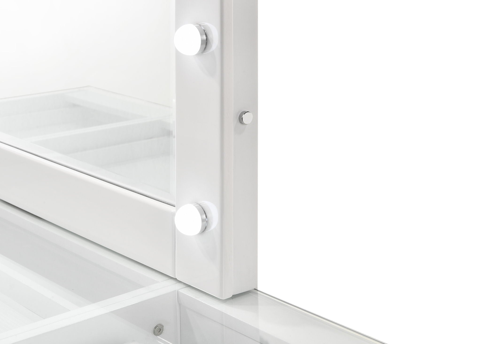 Step into a world of glamour with this sleek and chic vanity set, a perfect fusion of functionality and fashion. Its glossy finish and clean lines are complemented by the sparkle of crystal-like knobs, adding a touch of sophistication to your personal space. The spacious tabletop, graced with a large mirror surrounded by radiant lights, offers an ideal stage for beauty routines, ensuring flawless makeup application under impeccable lighting. With a variety of drawers, this vanity provides ample storage to keep essentials organized and within reach. The stool with its luxurious upholstery provides a comfortable seat that rounds out this vanity set, making it a must-have for those who appreciate a touch of luxury in their daily life.