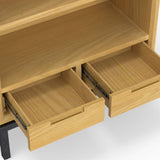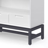 • Features two adjustable shelves, one fixed shelf with 2 small drawers on a metal frame and legs.