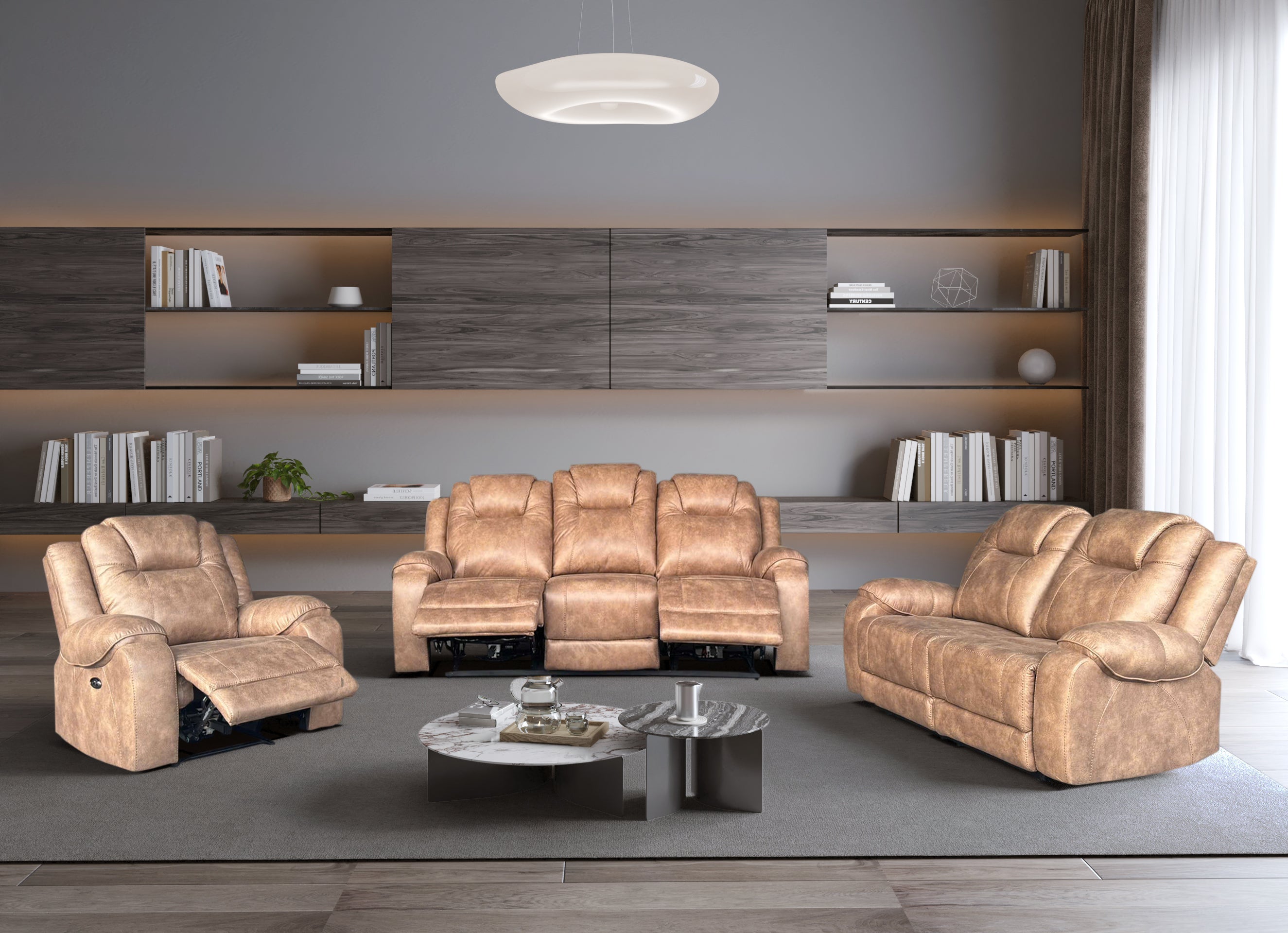Create a relaxed, family-friendly living room with this 3-piece beige power reclining living room set. Soft, generously padded seating and casual curves invite you to kick back, while the neutral faux-leather look in a warm beige tone blends effortlessly with modern, rustic, or traditional décor.