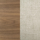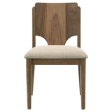 Accentuate the inviting style of your kitchen or dining room with a modern dining set. It offers fresh, contemporary flair with a walnut wood grain finish paired with beige upholstery on its chairs. The table features a trestle base and round post legs, offering casual ambiance for a welcoming home. Chairs are designed with wooden back and wedge details that add movement and character. Foam seat cushions are upholstered in beige fabric, offering neutral contrast and providing exceptional comfort and support for delicious meals.