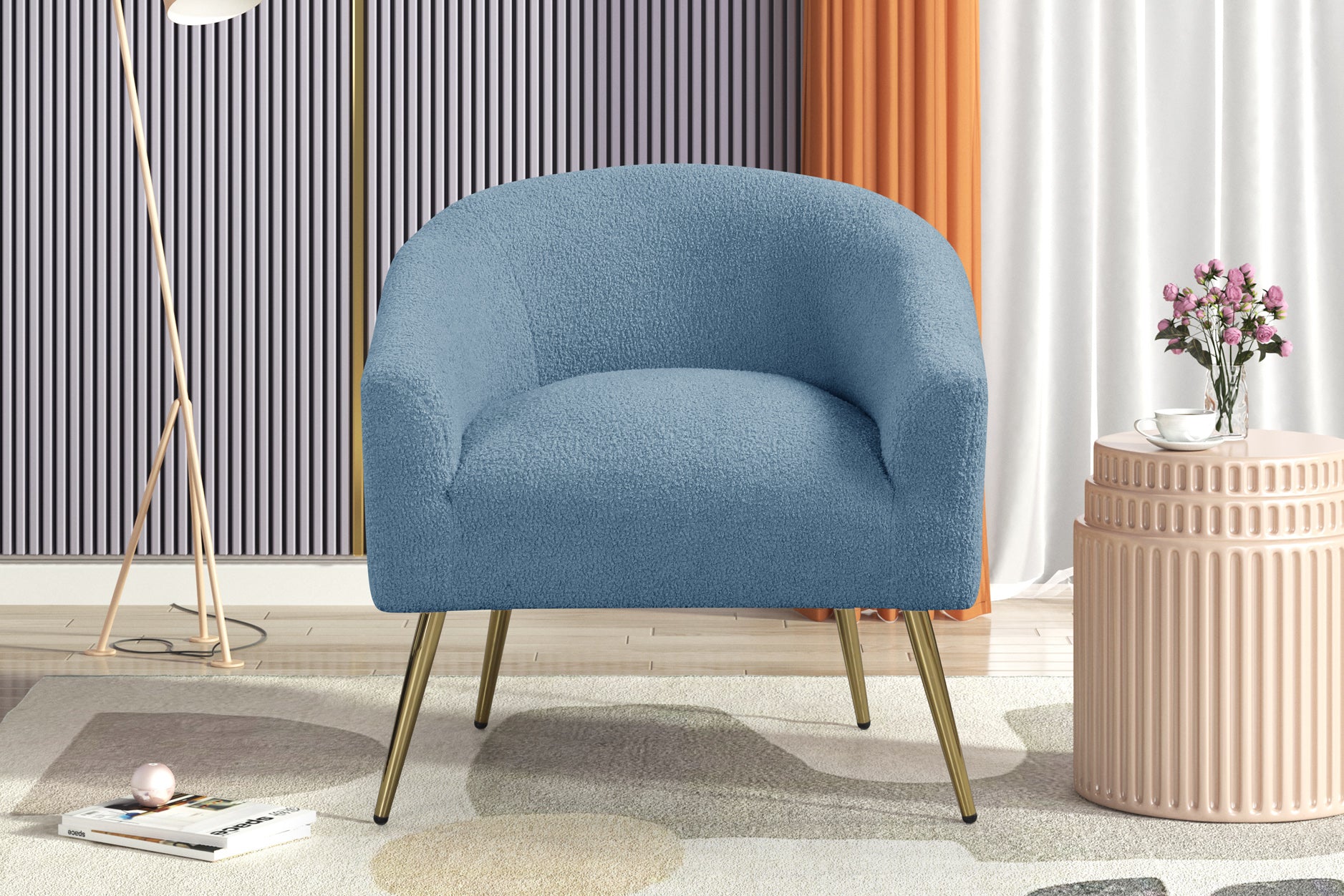 Add a splash of serene color to your home with this Blue Boucle Accent Chair. The cozy boucle upholstery in a soft blue shade and the elegant gold metal legs offer a perfect blend of comfort and modern style. This barrel chair is great for reading nooks, bedrooms, or as an eye-catching accent in your living room.