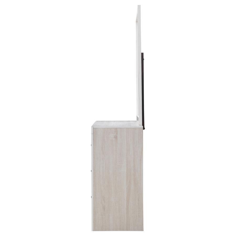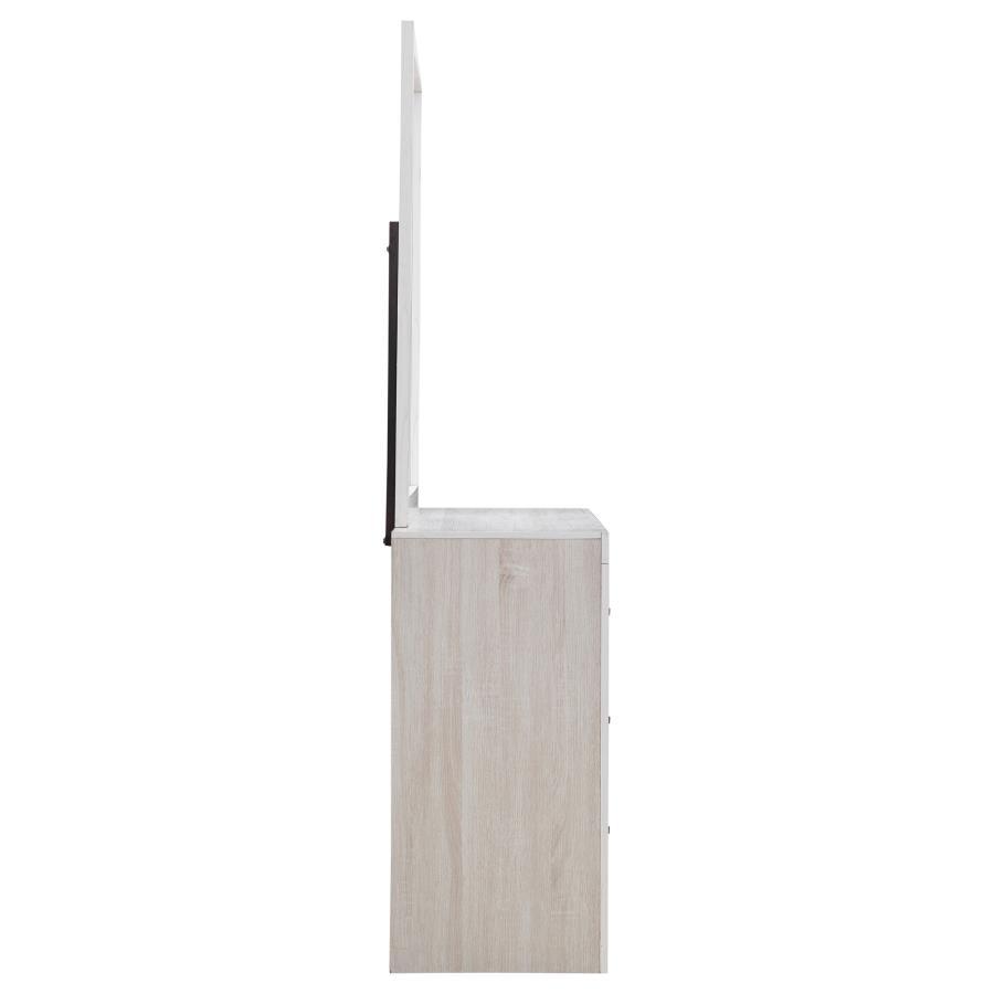 Enhance your bedroom with the bold and contemporary style of this wooden dresser. The modern design features 3D paper veneer for added quality and easy maintenance, while handles top each drawer, adding a classic touch. Deep storage drawers accommodate a variety of wardrobe essentials, making this piece as functional as it is stylish. Available in multiple finishes, this dresser easily adapts to any color palette. The large, rectangular mirror with a no-frills frame and quality 3D paper veneer enhances your space and is available in a range of attractive colors to suit your personal style.