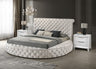 This avant-garde bed is a luxurious retreat, blending opulence with innovative design. Its unique round form challenges traditional bedroom aesthetics, offering a lavish centerpiece that is as comfortable as it is striking. The bed is generously upholstered in a plush black velvet, featuring exquisite button-tufted detailing throughout, which is both visually appealing and sumptuously tactile. Glamorous accents are provided by the studded embellishments along the headboard, adding a touch of sparkle and sophistication. The bed’s innovative design includes a practical storage system, discreetly hidden to maintain its sleek profile.