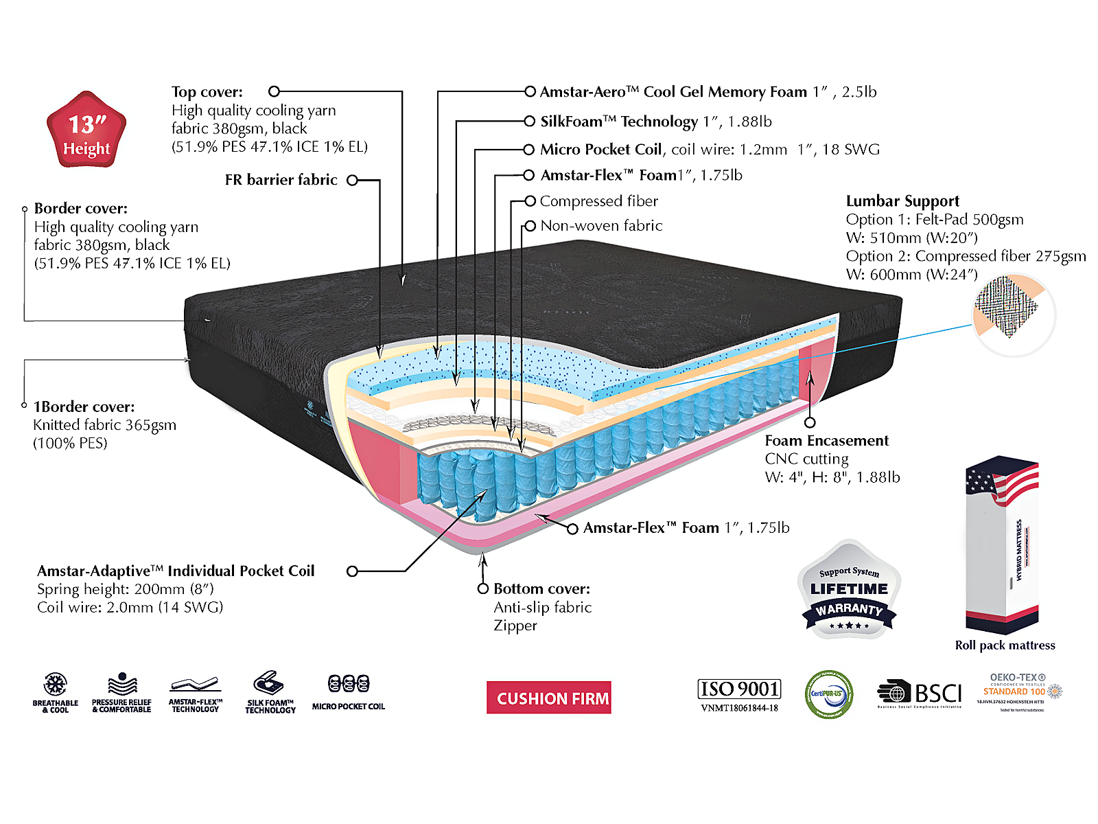 This mattress is breathable, pressure-relieving, and comfortable, featuring advanced technologies like Amstar-Flex™ and SilkFoam™. Certified by ISO 9001, OEKO-TEX Standard 100, and BSCI, it comes with a lifetime warranty. Plus, it's conveniently roll-packed for easy transportation and setup.