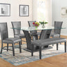 This sleek and modern dining group bridges form and function. The sculptural dining table has a sturdy base and the glass top allows views of the upholstered open shelf. Streamlined chairs and bench feature finished wood and upholstery for contrast.