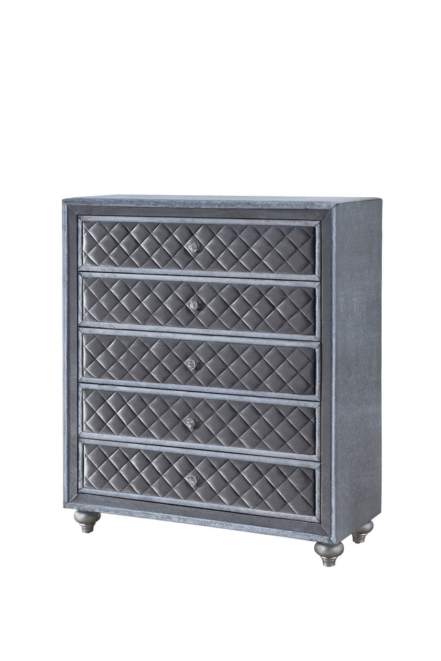 Indulge in timeless elegance and dramatic sophistication with this stunning bedroom collection, designed to make a bold statement. The centerpiece features an exquisitely tufted headboard with luxurious upholstery and intricate nailhead trim, exuding opulence and grandeur. Coordinating pieces showcase diamond-patterned tufted accents, mirrored details, and polished hardware, blending classic design with modern glamour. With ample storage and impeccable craftsmanship, this ensemble offers both style and practicality, creating a lavish retreat that embodies refined comfort and striking aesthetics. Perfect for those seeking a bedroom that radiates luxury and charm.