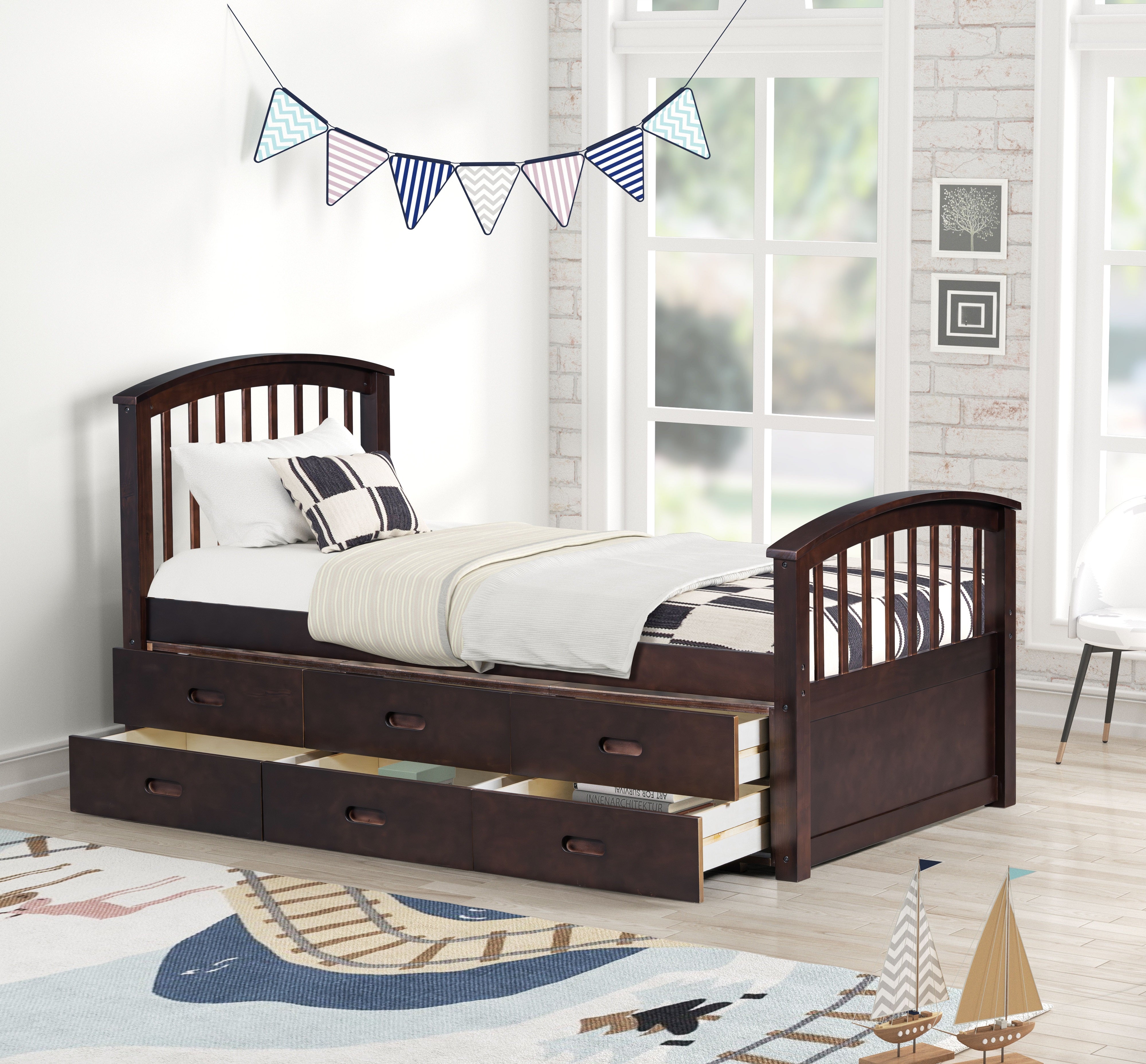 This twin-size captain is a reliable and sturdy option for your kid that features a classic style and solid wood construction. It comes with built-in wooden slats that provide enough support for your mattress, eliminating the need for a box spring. The bed also features 6 deep drawers underneath for practical storage, saving space in your child's room. The arched headboard and footboard are decorated with grid panel accents, giving it a classic appearance, while the engraved perimeter adds a refined touch. It's manufactured with solid pine wood and solid mattress support slats, ensuring heightened durability and reliable support for years to come. Its timeless design can blend in with any color scheme and existing furniture, making it a great investment for your bedroom that can grow with your child over the years.