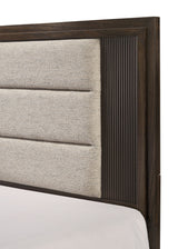 Create a warm and inviting retreat with this beautifully crafted bedroom ensemble, where timeless design meets modern functionality. Featuring a rich finish and sleek, linear details, this collection strikes the perfect balance between charm and contemporary sophistication. The centerpiece showcases a plush, upholstered headboard framed in deep tones, offering a cozy and elegant touch. Matching storage pieces provide generous space to organize your essentials, all accented with polished hardware for a refined look. Perfect for those seeking style and practicality, this group transforms your space into a harmonious haven.