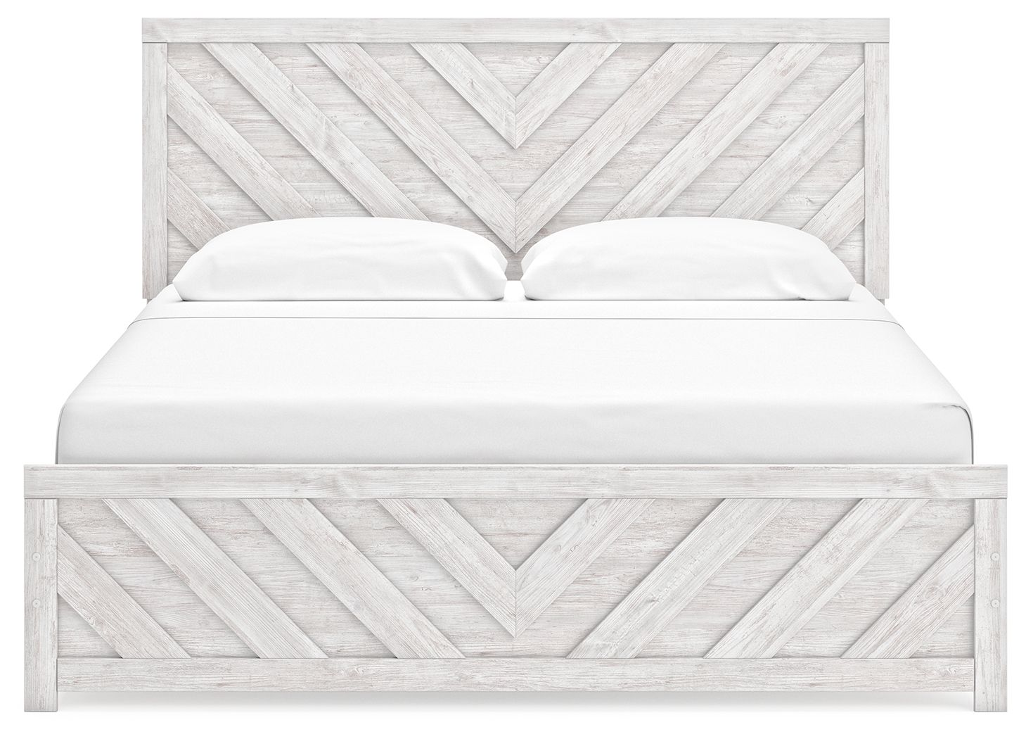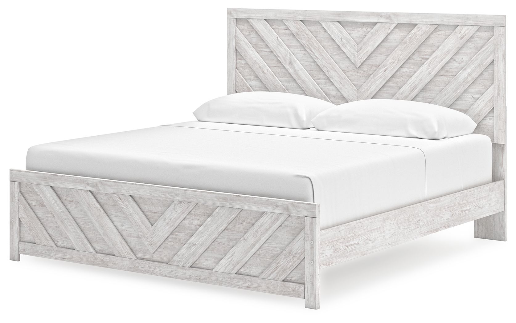 Charmingly designed, this king panel bed embraces the aesthetics of countryside living and repurposes them for modern settings. Its whitewash paint, replicating the wear and tear of time, appeals to your love of vintage character. And a chic chevron pattern on the headboard and footboard keeps your bedroom effortlessly on trend.