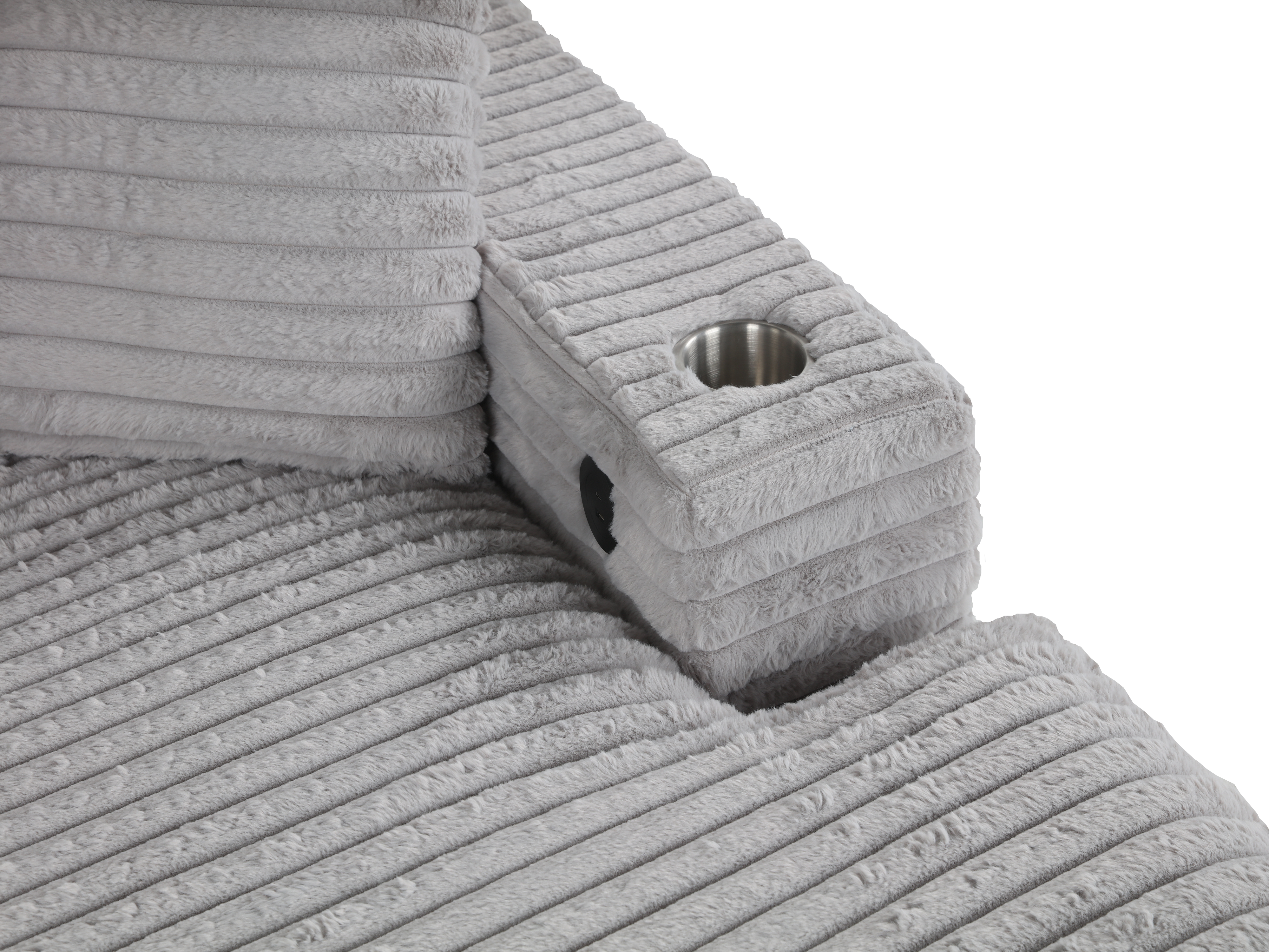 This luxurious chaise lounge combines modern functionality with timeless comfort. Upholstered in a grey velvet fabric, it exudes elegance while providing the ultimate relaxation experience. The chaise features three large backrest pillows and two throw pillows, all designed with a plush ribbed texture for added coziness and support. Both armrests are thoughtfully equipped with built-in cup holders and USB charging ports, ensuring that your beverages and devices are always within easy reach. Perfect for lounging, reading, or watching TV, this chaise lounge is a stylish and practical addition to any living space. Its sleek design complements contemporary interiors, making it an ideal choice for those who value both comfort and convenience.