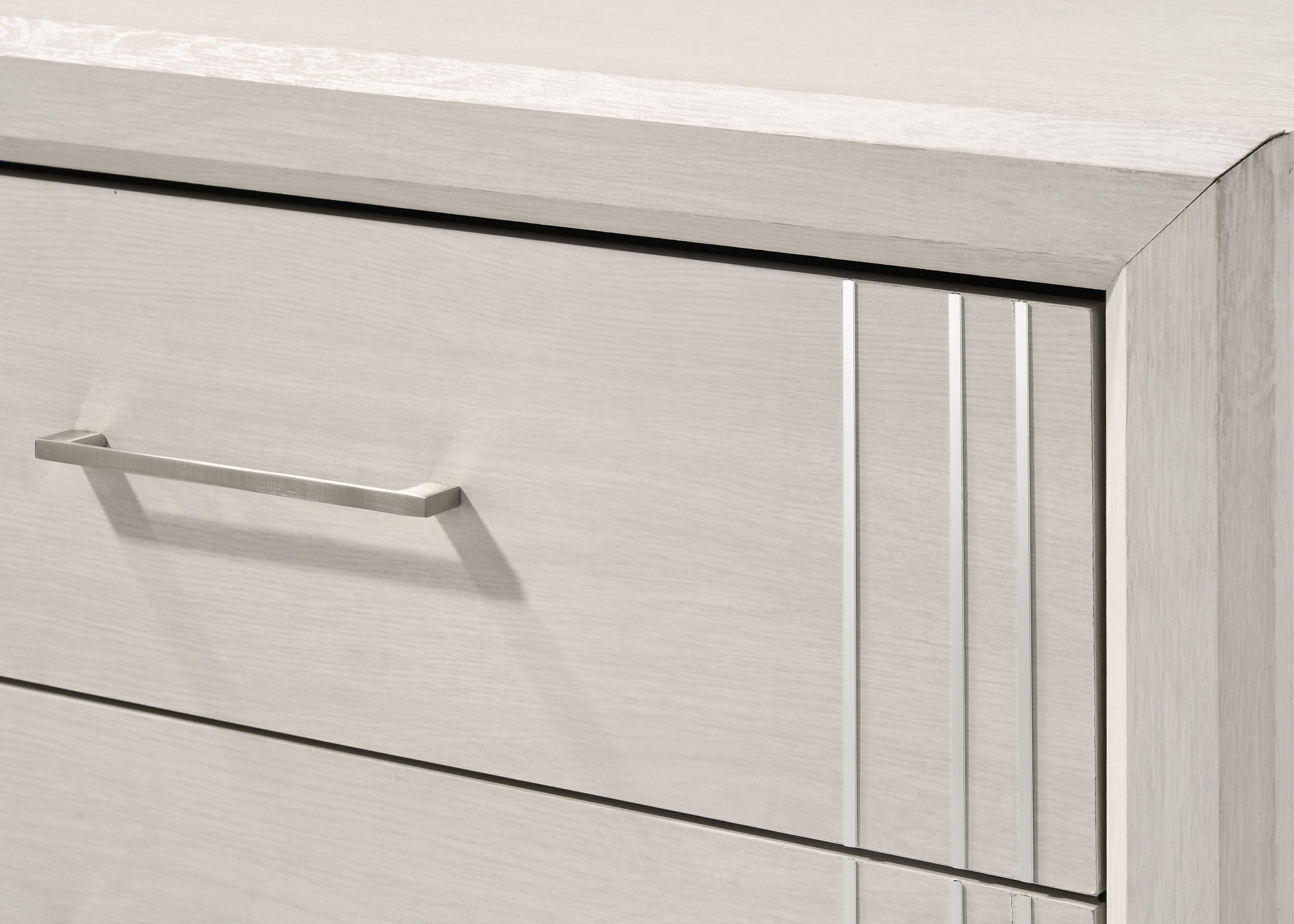 This elegant bedroom collection presents a sophisticated ensemble perfect for creating a refined modern aesthetic in your sleeping quarters. The suite features a sleek, minimalist design with crisp, clean lines and a rich finish that exudes contemporary charm. Anchoring the set is a robust panel bed with a prominent headboard, promising a sturdy and stylish centerpiece. Flanking the bed are complementary case pieces, offering ample storage with their smooth-gliding drawers accented with chic silver-toned hardware.