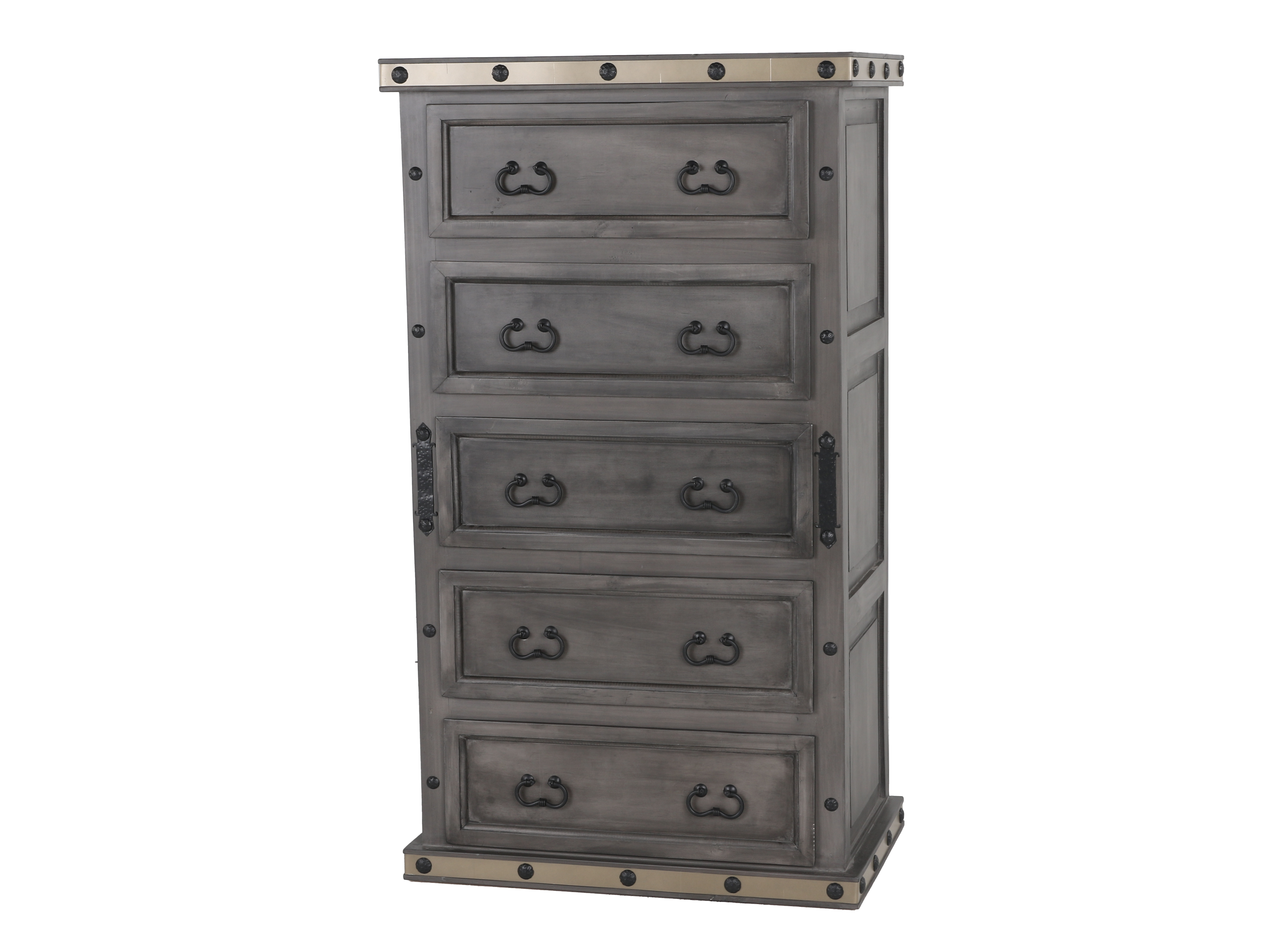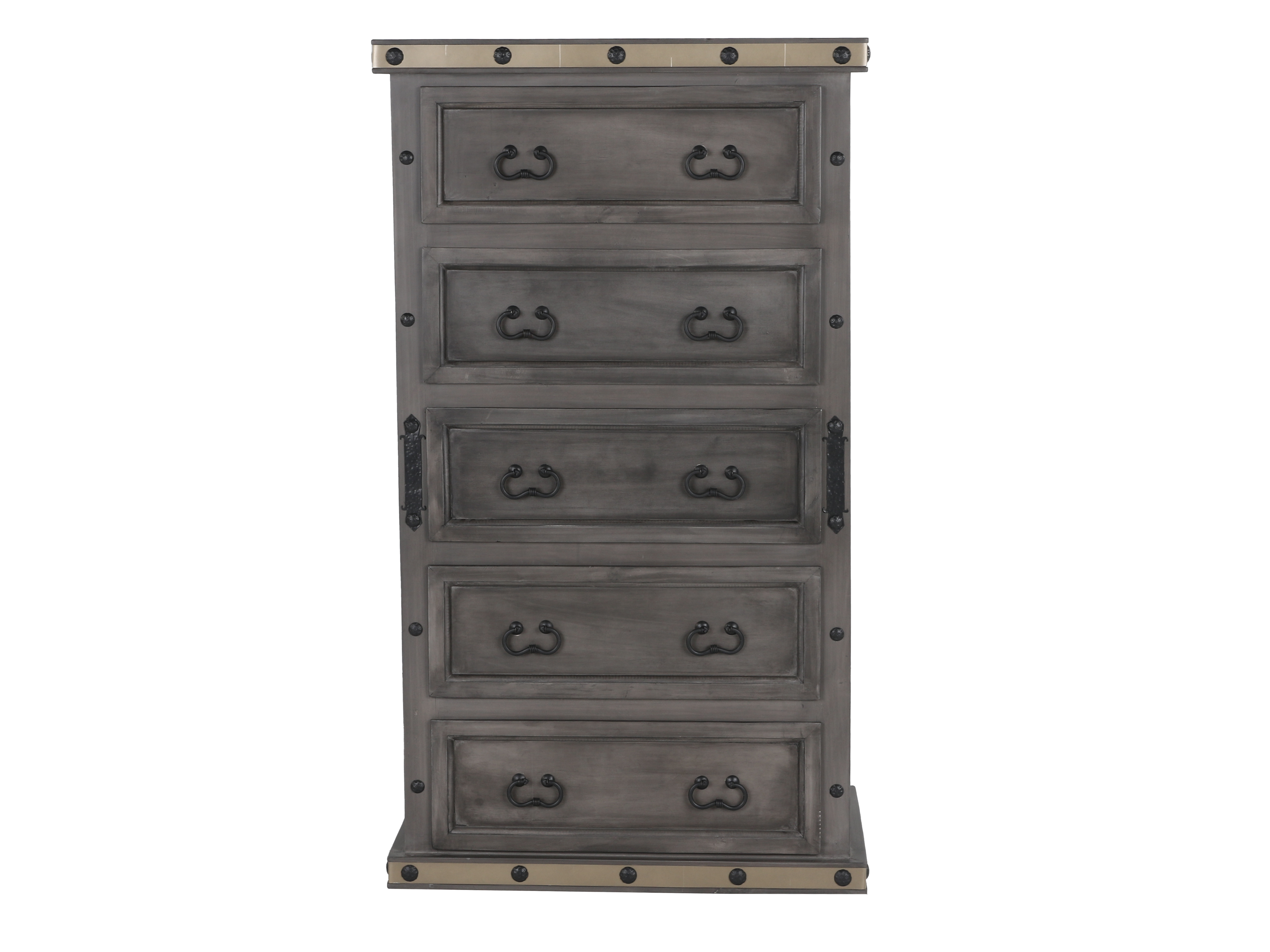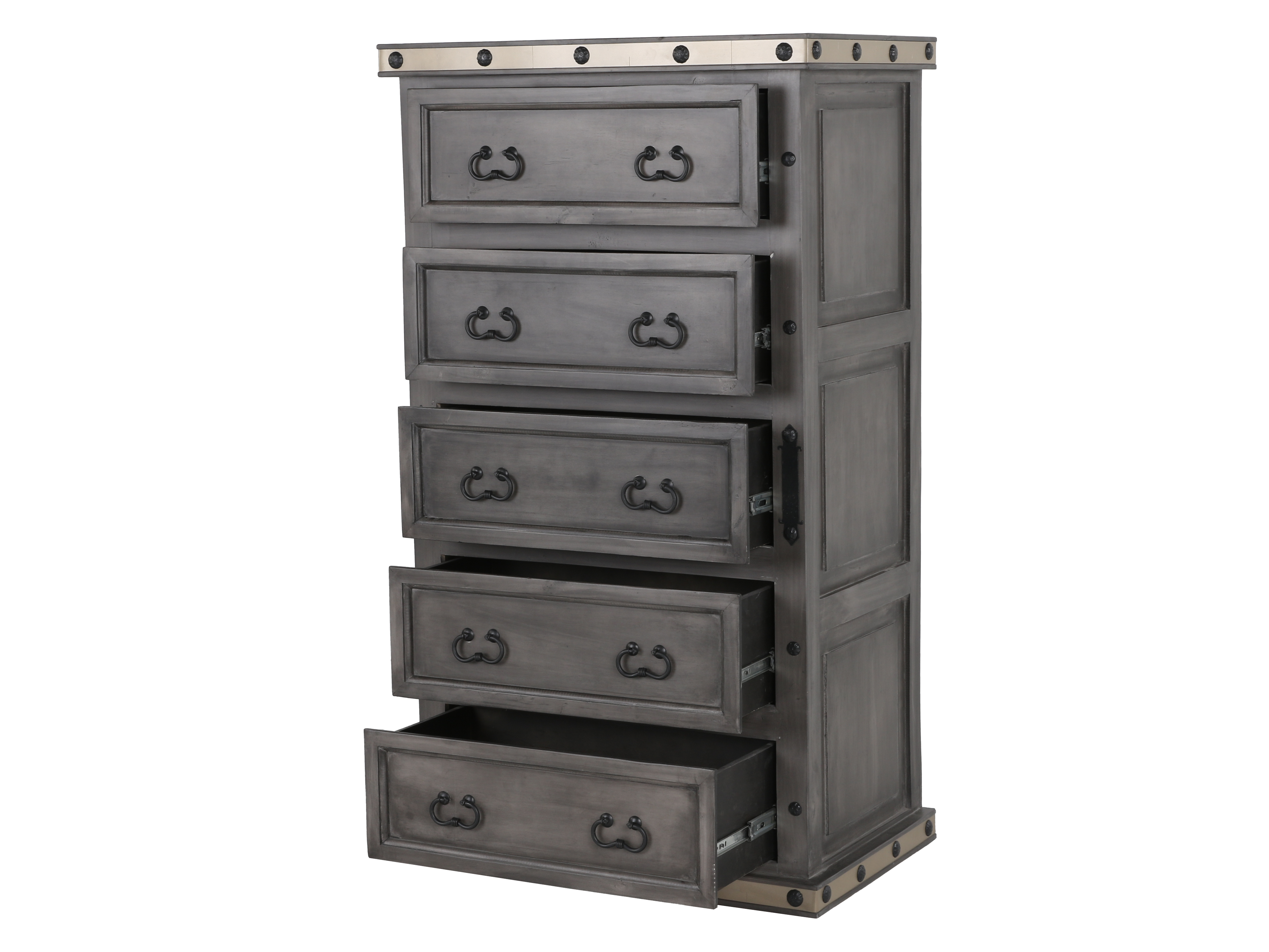 This chest is a perfect blend of rustic charm and industrial flair. It is crafted from solid wood, showcasing a natural, weathered finish that highlights the wood’s unique grain and texture. The design features five spacious drawers, each fitted with sturdy metal handles that provide a comfortable grip and add to the chest’s industrial appeal. Metal trim adorns the top and bottom edges, enhancing its durability and giving it a distinctive look. The drawers glide smoothly for easy access, while the robust construction ensures longevity. This chest is an ideal storage solution for any bedroom, living room, or hallway, offering both functionality and style. Whether you’re looking to add a touch of rustic elegance to your home or need a practical storage piece, this chest is sure to meet your needs.