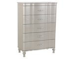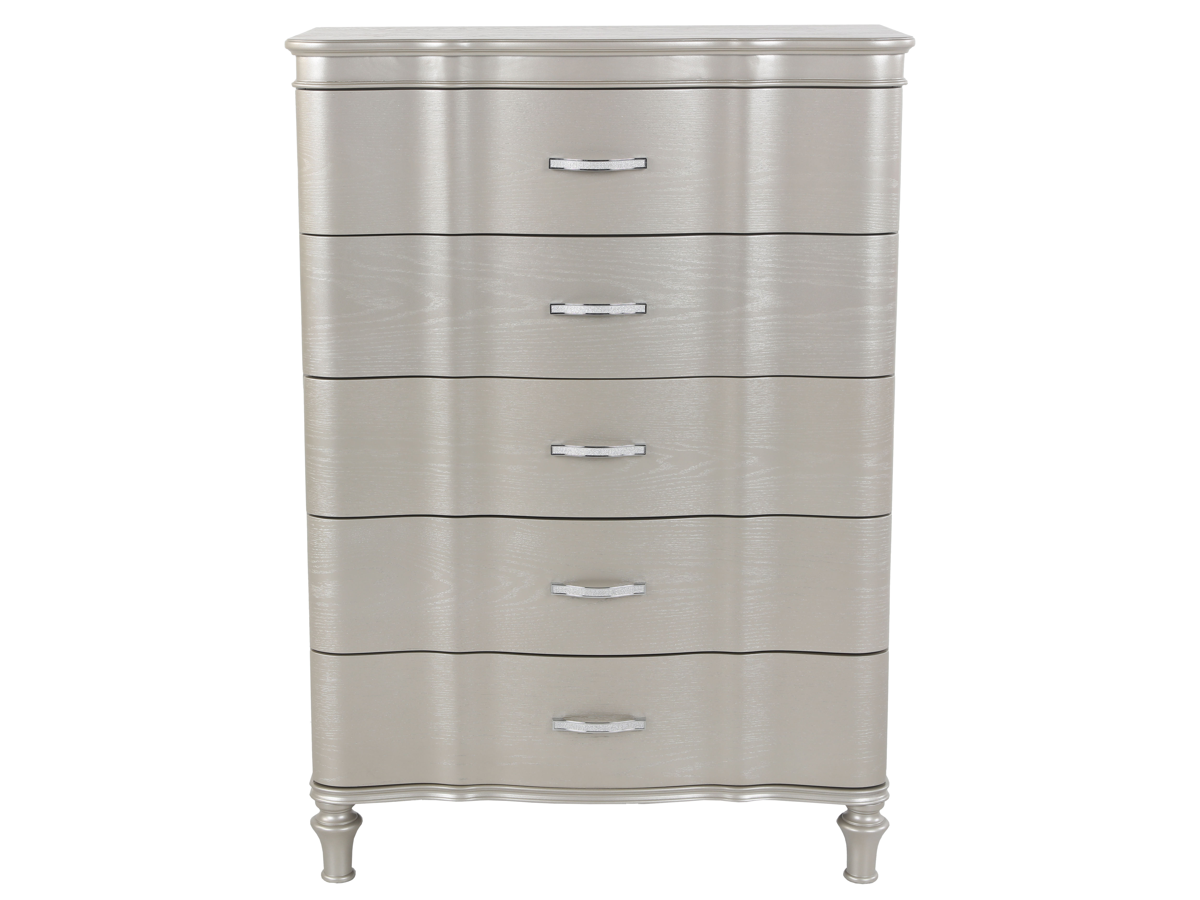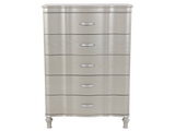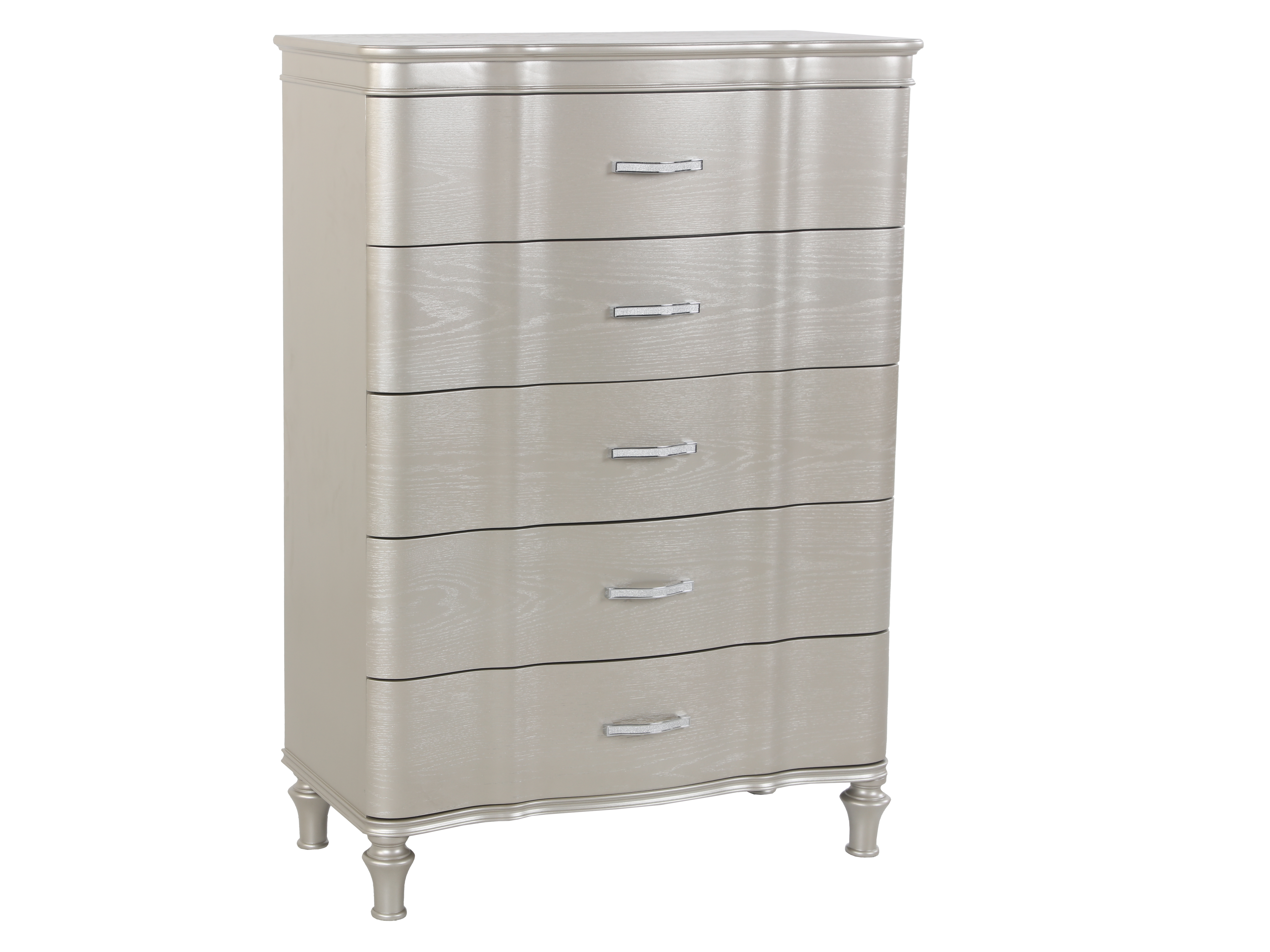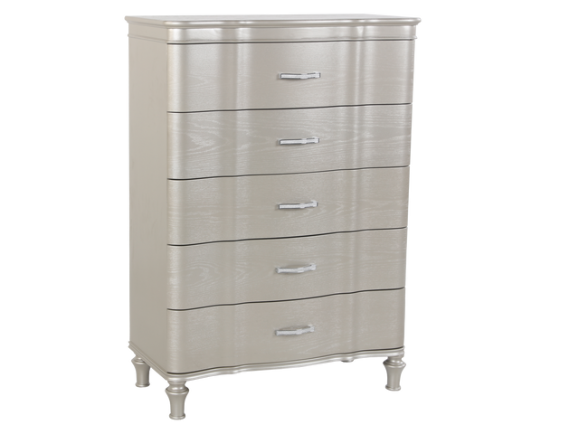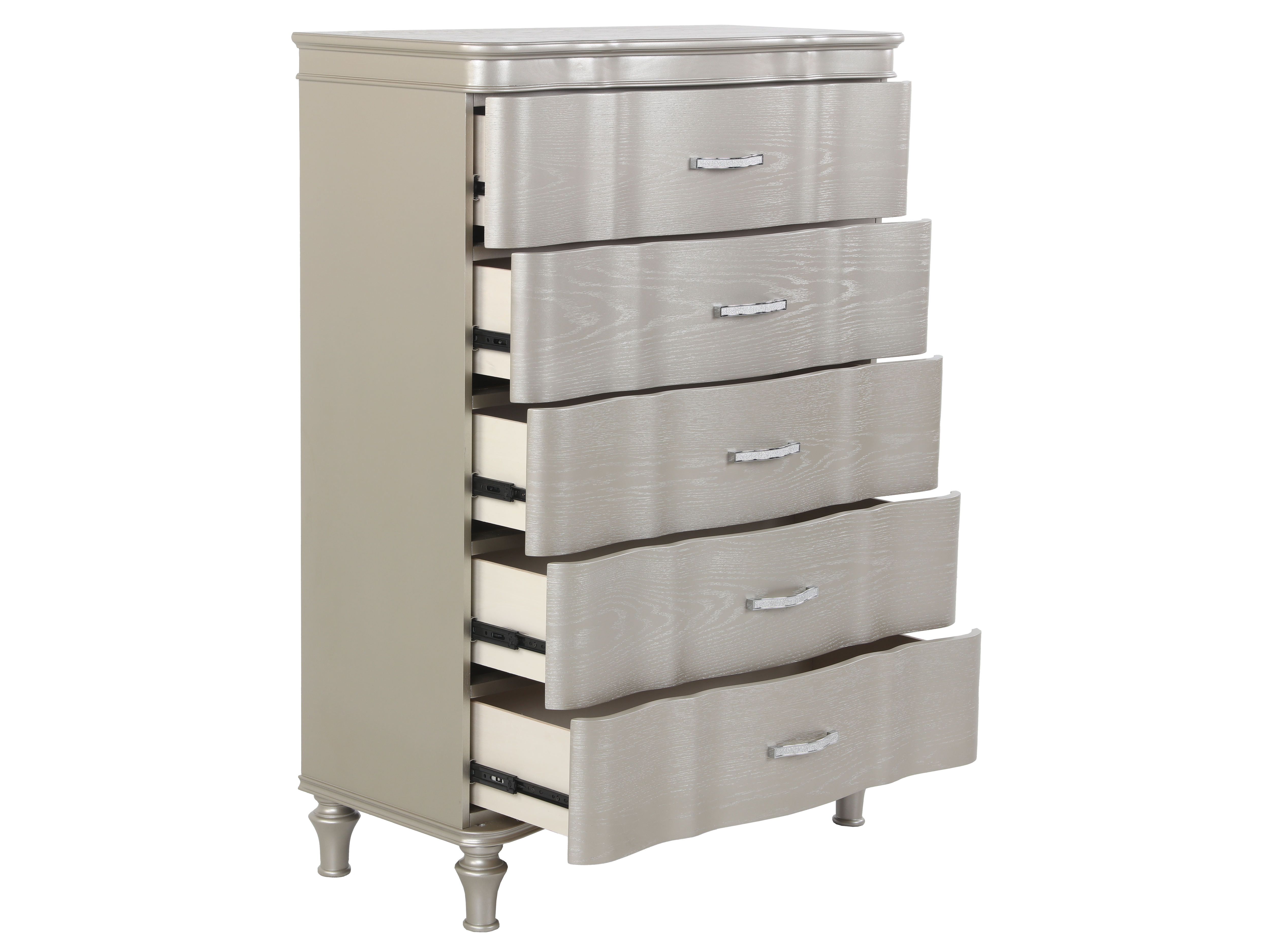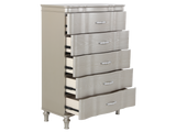 Complete your bedroom with this stylish five-drawer chest, designed to offer both elegance and practicality. Featuring a sleek silver finish with a textured wood grain design, this chest exudes modern charm while providing plenty of storage space for clothing and accessories. The crystal-like drawer pulls add a subtle touch of glamour, complementing the clean lines and tapered legs for a sophisticated look. Whether used as a standalone piece or paired with the matching bedroom set, this chest enhances your space with timeless elegance and superior functionality.