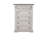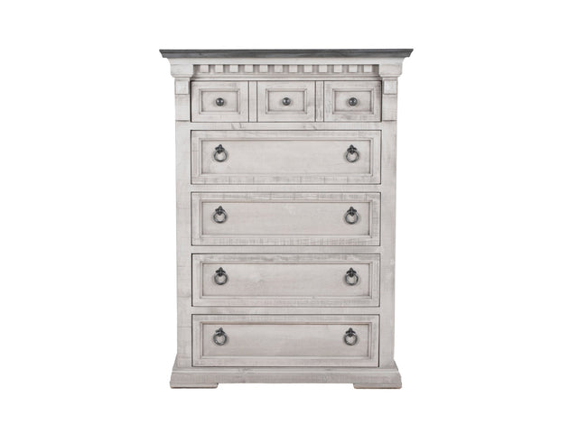 This chest exudes a sense of antique opulence with its distressed white finish and intricate detailing. With five drawers, it offers ample storage space, and its top drawers are felt-lined and feature Zamak pulls. The drawers are crafted with English dovetails and full-extension side mount metal glides, providing both a classic touch and modern functionality. The iron gray top serves as the perfect finishing touch, adding a dramatic element to this stunning piece of furniture.