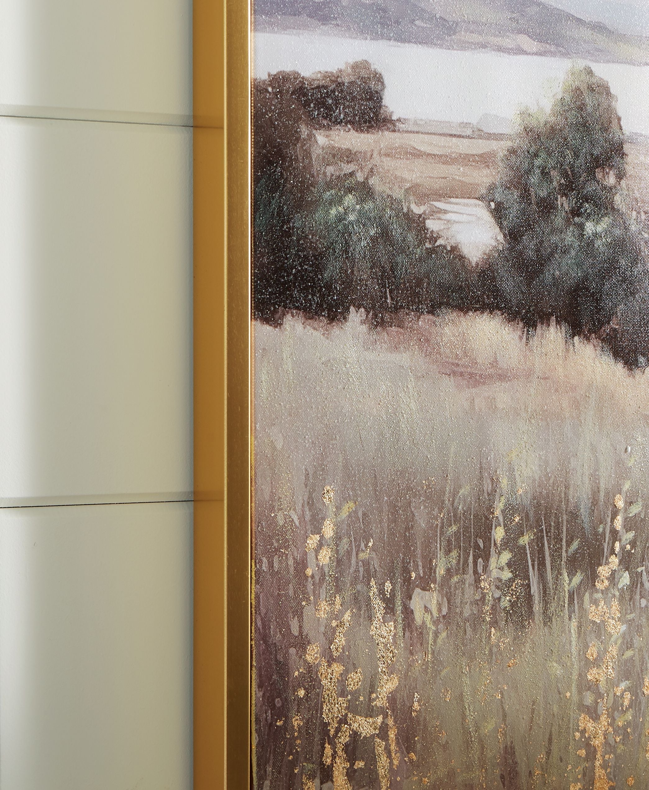 This wall art puts a peaceful spin on hanging decor. Its quiet landscape invites you to a lakeside field, with rolling mountains in the background that bring depth to the design. Hand-painted and gold leaf embellishments make each piece unique.