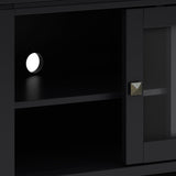 • Features two (2) sliding tempered glass doors that open to a cabinet with two (2) adjustable shelves