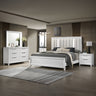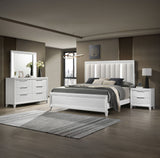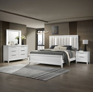 This bedroom set is the epitome of modern elegance, designed for those who desire a sleek and sophisticated sleeping environment. The crisp finish of the furniture brings a refreshing vibrancy to the room, making it feel both spacious and inviting. The centerpiece, a plush upholstered bed, features an impressively tall headboard with deep channel tufting and integrated lighting, creating an aura of luxury and comfort. Accompanying the bed are streamlined nightstands and a dresser, each boasting a minimalist design with distinctive textured front panels and discreet handles that enhance the set's contemporary charm. The matching backlit dresser mirror expands the visual space and completes the look, making this collection a perfect blend of function, style, and comfort for the modern home.