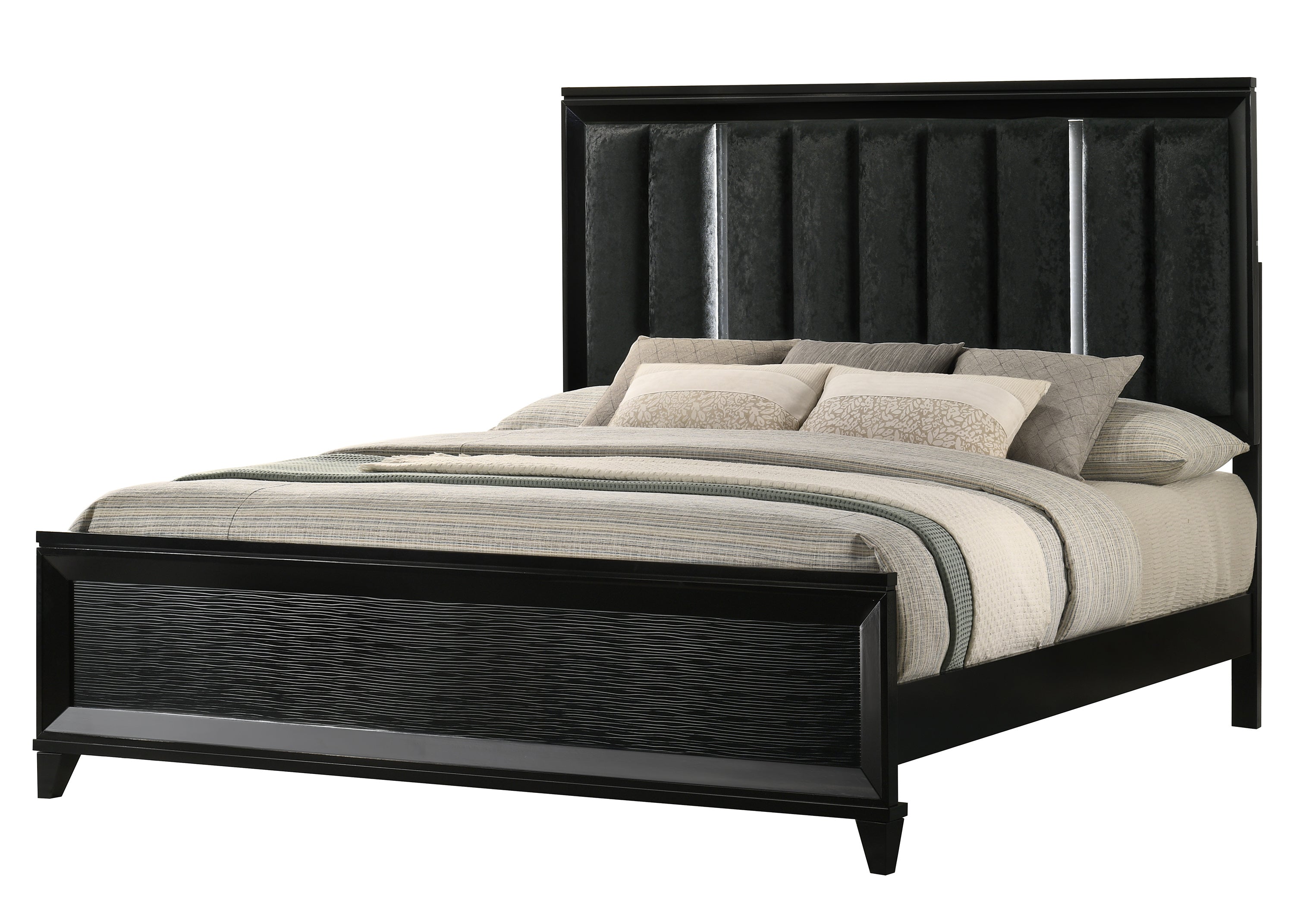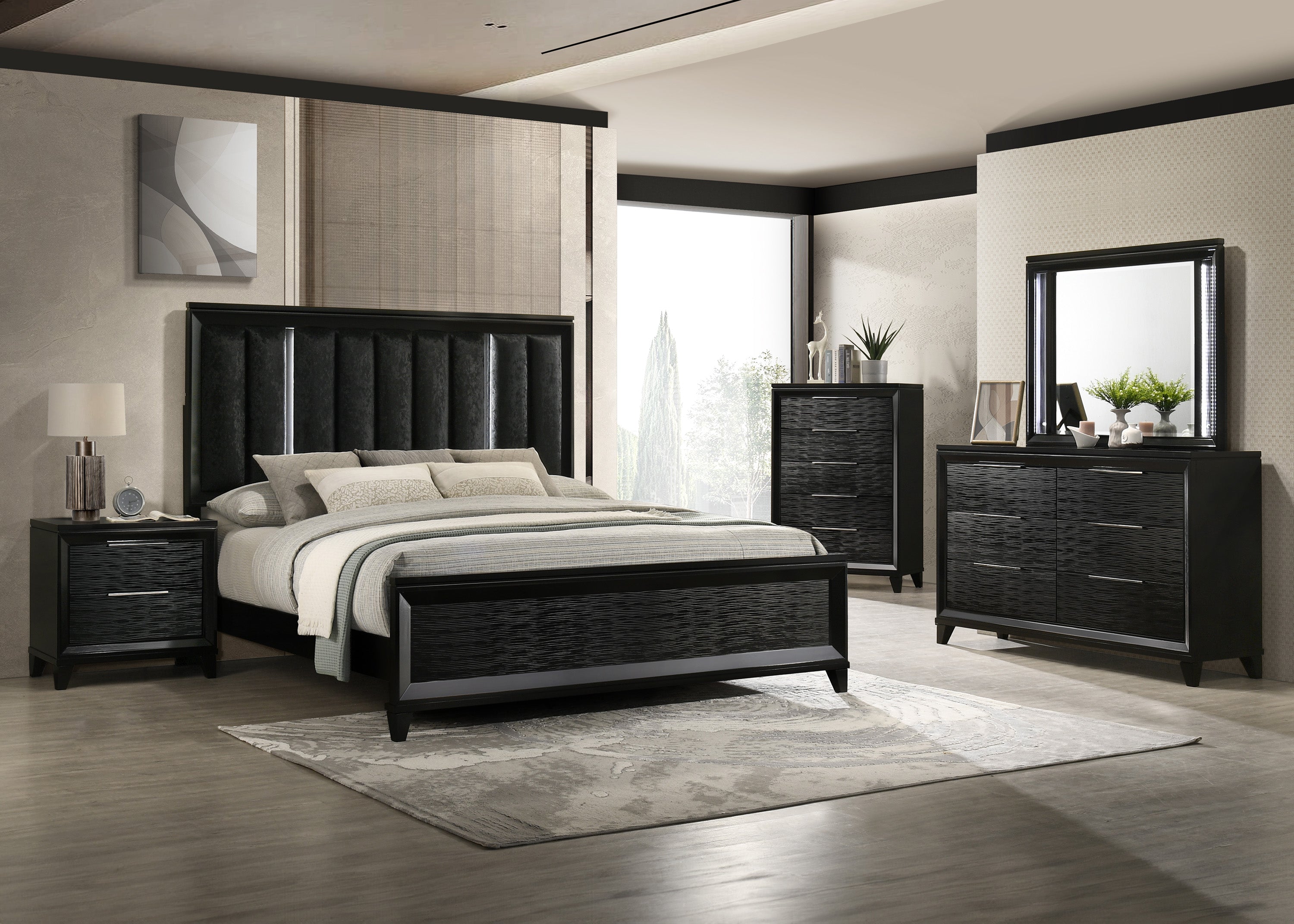 This bedroom group showcases a contemporary design characterized by sleek black finishes and clean, minimalist lines. The centerpiece is a generous bed featuring a tall, tufted headboard with integrated lighting, adding a sophisticated and functional touch. Complemented by matching nightstands, dressers, and a tall chest, each piece offers ample storage with streamlined hardware, combining style with practicality. The collectionÕs cohesive design and integrated lighting elements create a modern, inviting atmosphere, transforming your bedroom into a luxurious retreat that seamlessly blends functionality with exquisite style.. Wave textured footboard panel Solid finish Channel tufted