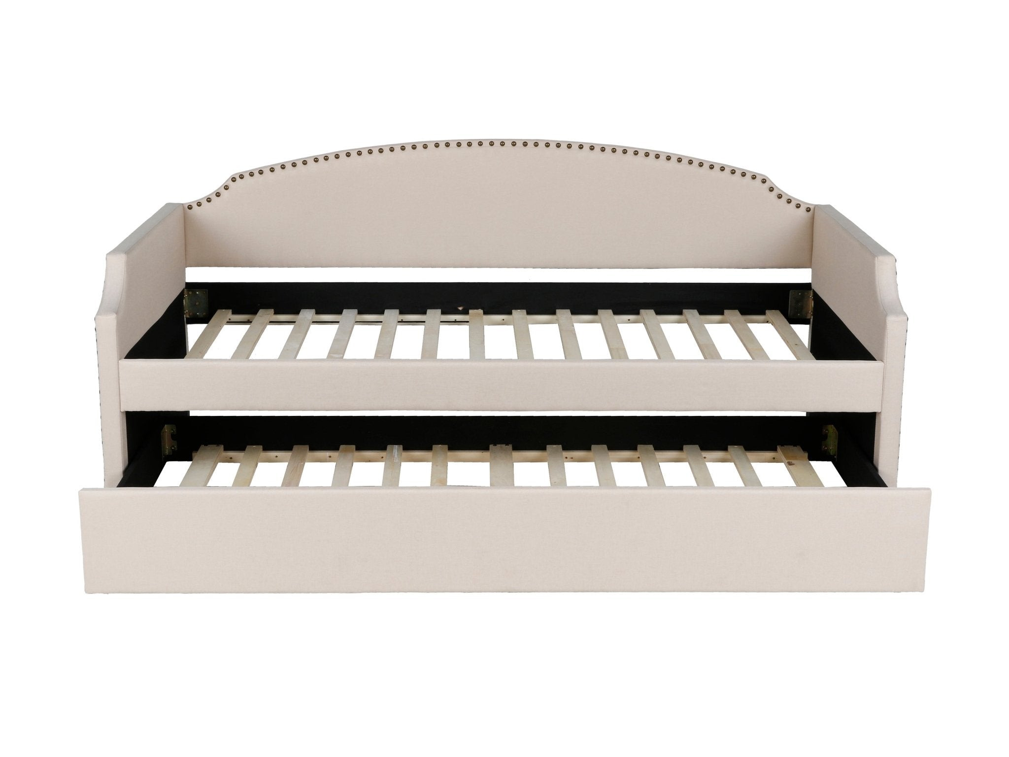 Ideal for guest rooms and living spaces, daybeds like this one offer the perfect combination of seating and snooze spots. Crafted with a solid and engineered wood frame, this daybed is upholstered in 100% polyester. It boasts notched arms, an arched back, and nailhead trim, lending a touch of classic elegance with a hint of French country inspiration to any room. Designed to accommodate a twin-sized mattress, it goes the extra mile with its built-in trundle bed, allowing more than one guest to enjoy a restful night's sleep. The daybed, featuring a convenient roll-out trundle bed, effortlessly transforms any space from a living room to a bedroom. Combining functionality with style, this daybed features an exquisite cut-out frame adorned with chrome nailheads for a touch of glamour. It serves as a sofa, a bed, and an additional bed, all in one.