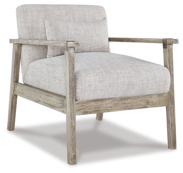 Keep your seating casually cool with this accent chair. The clean-lined design sports a gray finish for a modern appeal, while light neutral upholstery in a herringbone pattern creates textural interest. Antiqued pewter-tone accents add a touch of urban flair, rounding out this relaxed take on contemporary style.