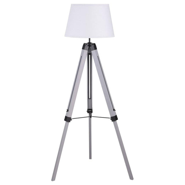 Go modern as you supply ambient lighting in a home office or living space, choosing the Dayton floor lamp to begin a cool look of both studio and contemporary attitudes. This tripod style lamp is perfect for retro design schemes and for upbeat modern settings. A hint of rustic charm comes in a weathered gray wood tripod upper base and extended legs made of metal. This lamp is a bright and cheery addition to a casual room, including a crisp white linen-like tapered drum shade. Operates with a rotary switch located on its socket.