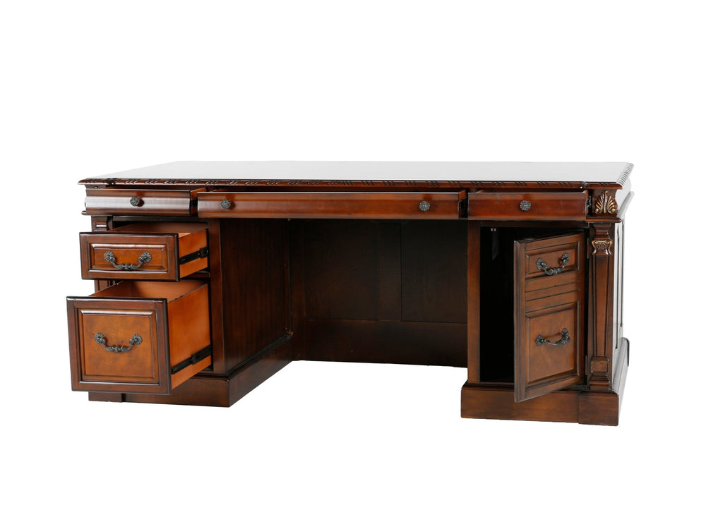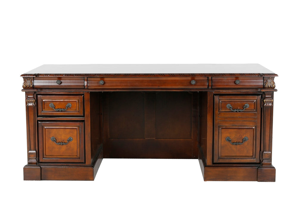 Elevate the elegance of your office or library with the distinguished presidential executive desk. With its intricate carvings and fluted details, this stunning desk is sure to impress. The rich brown finish adds to its sophistication. In addition to its stately appearance, the desk feature timeless metal drawer pulls for a classic touch.