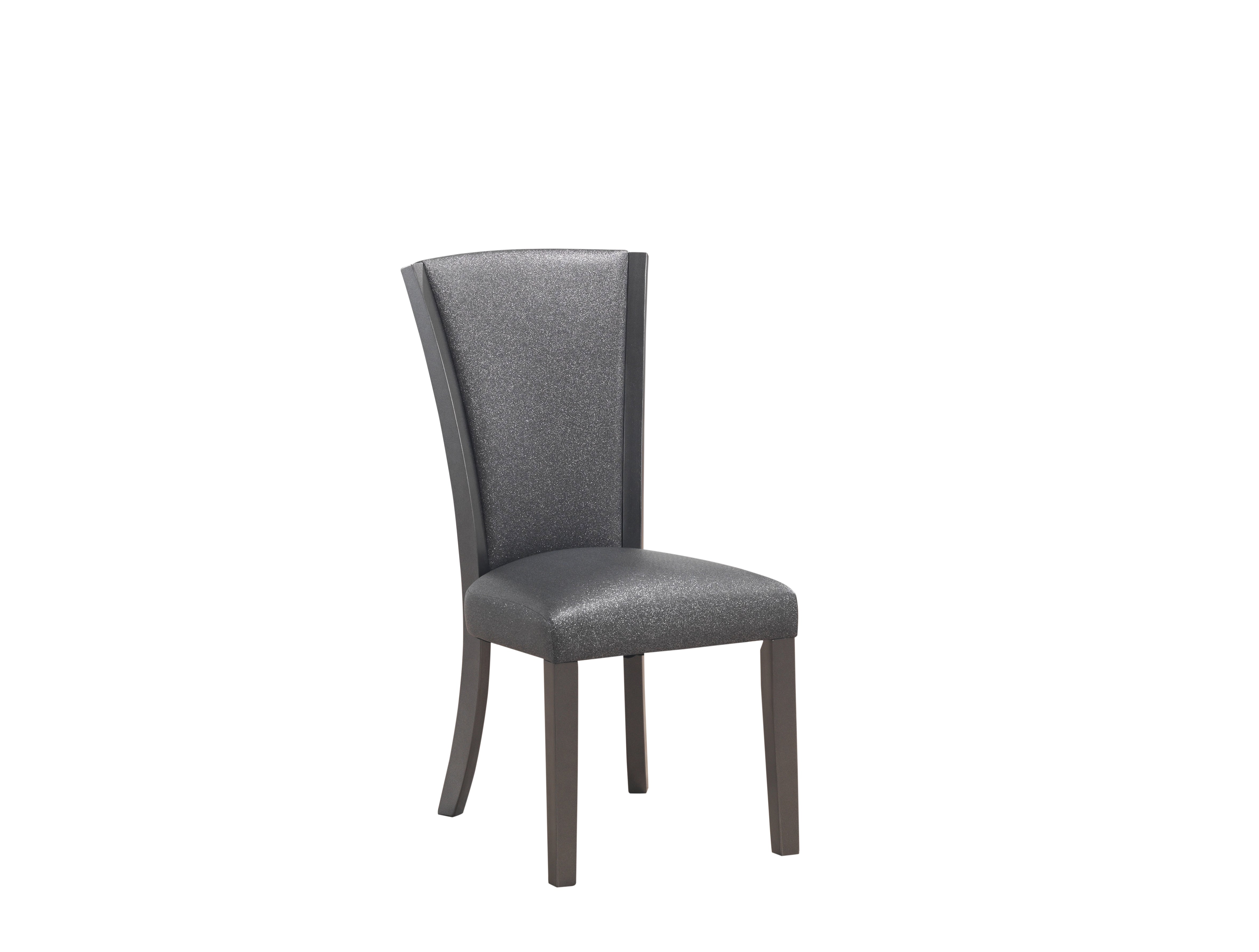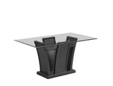 Elevate your dining experience with this sleek and contemporary glass dining room set. Featuring a stylish glass-top table with a bold metallic wooden pedestal base, this set is designed to make a statement in any modern home. The accompanying six chairs are upholstered in a sophisticated gray fabric with a subtle shimmer, offering both comfort and elegance. Perfectly suited for family dinners or entertaining guests, the combination of clean lines, neutral tones, and durable materials makes this set a timeless addition to your home. The spacious table provides ample room for meals and décor, while the padded chairs ensure lasting comfort.