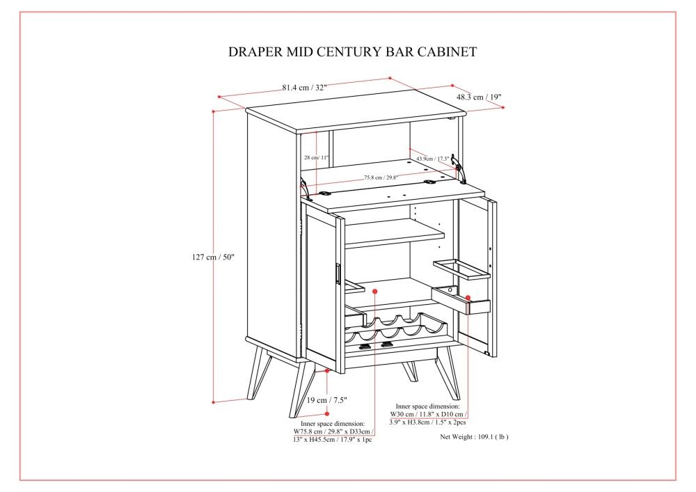 • The two door and two shelf cabinet features storage for 7 bottles of wine, stemware, cocktail, barware essentials and drop-down door doubles as work surface