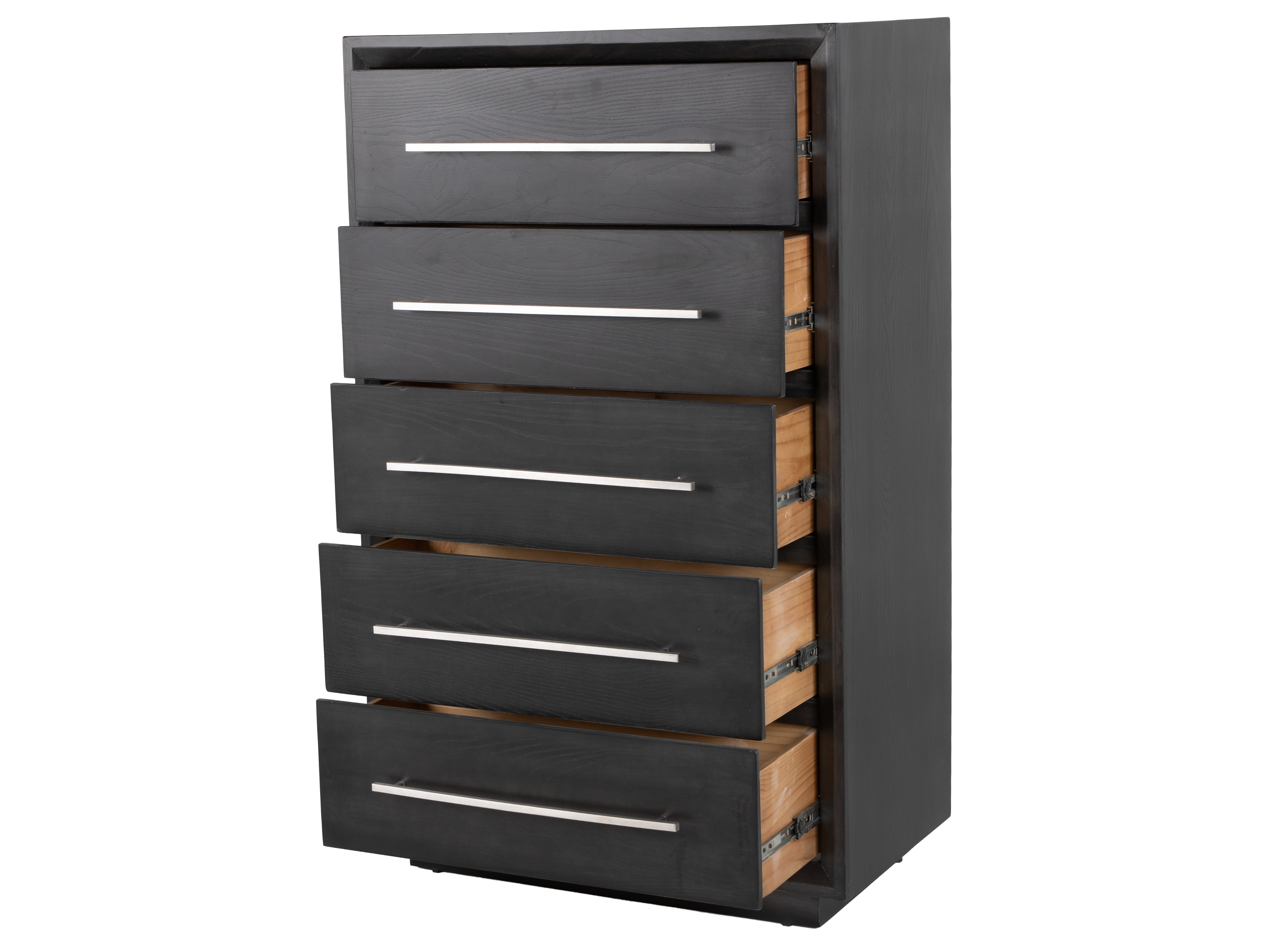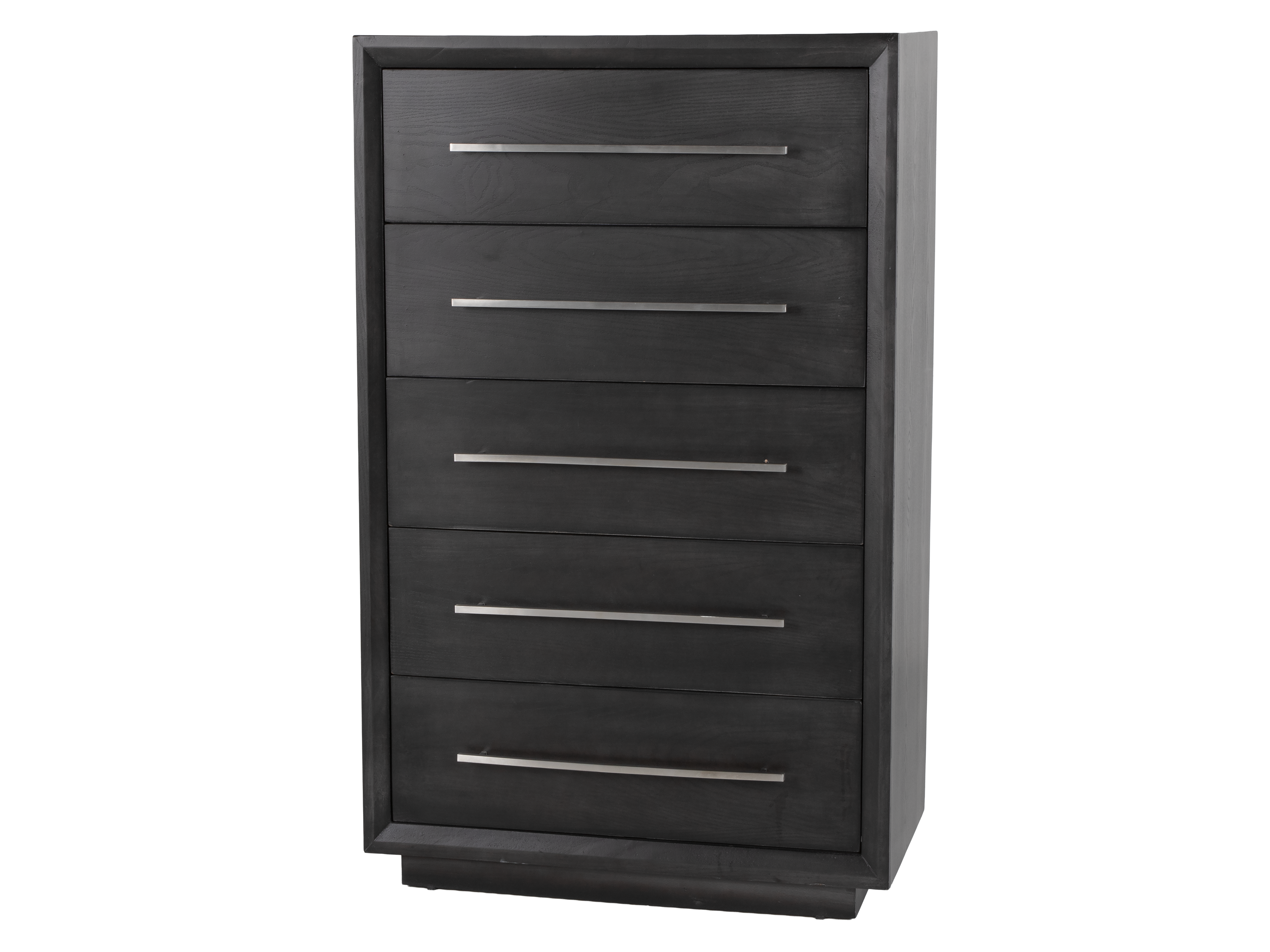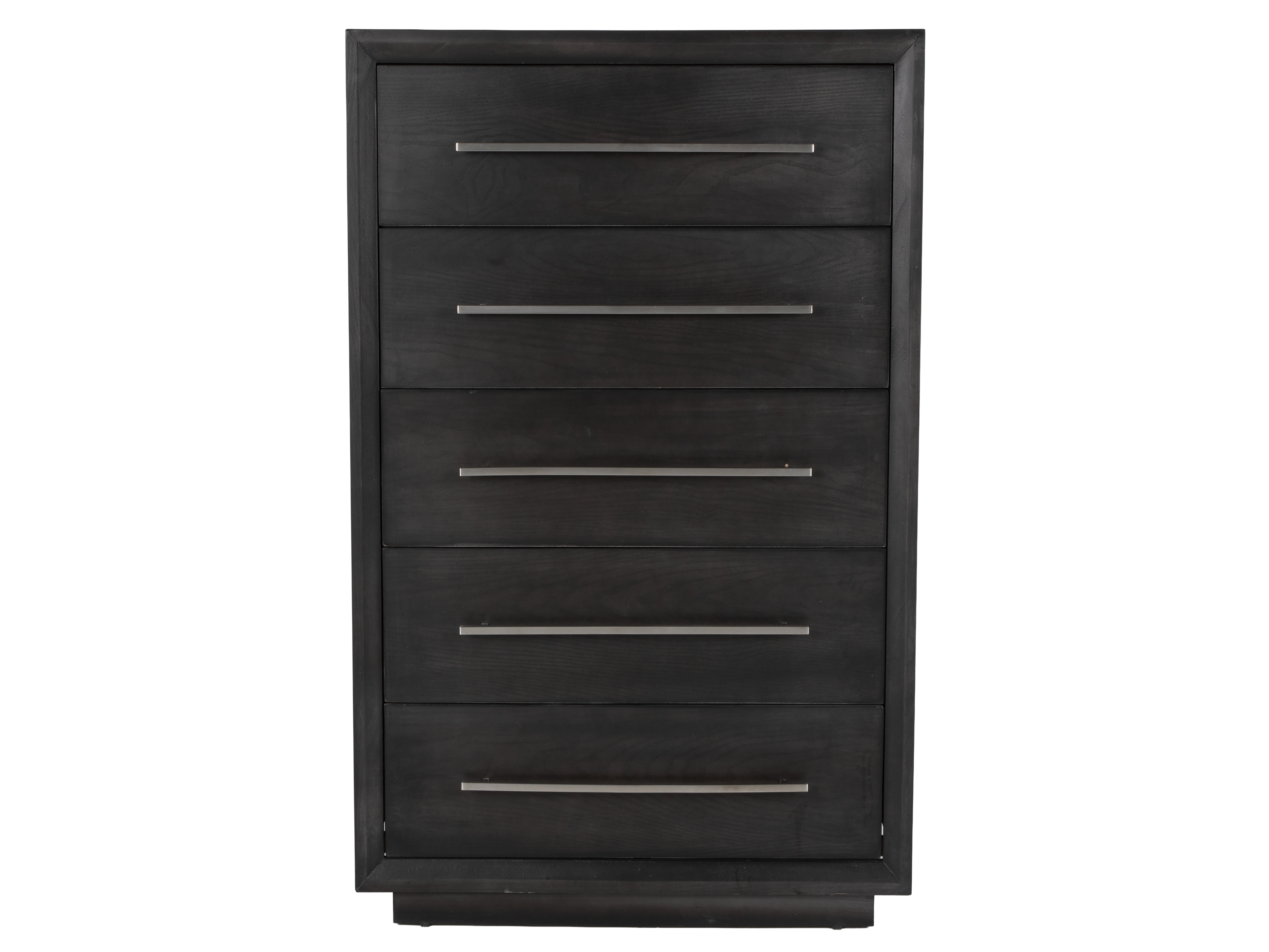 The chest features five smooth-glide drawers with long brushed nickel bar handles for a crisp, contemporary look. A framed front design and rich dark finish add depth and style, while the sturdy silhouette keeps your space feeling polished and put-together. Pair it with the matching bed, dresser, and nightstand for a cohesive bedroom set, or style it as a standalone storage piece.