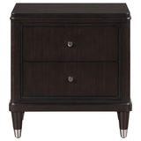 Accentuate bedroom decor with the chic look and impressive functionality of a modern two-drawer nightstand. Its sleek look is accentuated with delicate trim and petite round knobs on each drawer. A dark brown finish ensures a versatile palette, complementing in a variety of bedroom settings to create a warm, soothing ambiance. The top drawer includes felt lining and the bottom drawer cedar, adding protection to your bedside storage. Tapering feet complete the look with metallic finish caps, offering a touch of contrast and depth at your bedside.