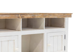This rustic TV stand brings farmhouse charm and plenty of storage space to your living room or bedroom. It's made of solid and engineered wood in a distressed antiqued white finish for a vintage feel. Plus, this TV stand gives you lots of storage: The two cabinets for board games, throws, and more. And the three open shelves with cable cutouts are just right for your entertainment units while keeping wires out of sight.