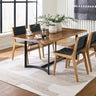This dining package takes minimalism to the max. Urban Contemporary design. Made with solid Acacia wood, metal and woven leather straps. Finished in a light wood tone to enhance the wood's natural grain characteristics. The solid wood table top features a natural live edge making each table uniquely one of a kind. The dining chair is made with solid wood frames with woven leather to create the seat and back rest. Bronze colored nail heads used to attach the leather add a touch of sophistication.Your search for simple, contemporary design ends here.