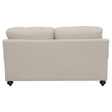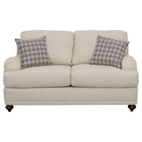 Made for a modern farmhouse living room, this elegant sofa and loveseat feature tailored english saddle style arms and t-shaped cushions.wrapped in a linen-like fabric, this set lends a charming, country quality to a space.resting on dark brown turned legs, each piece offers a homely elegance.included with each are accent pillows in a plaid and houndstooth patterns.place this set in a room to create a traditional-inspired design aesthetic.