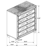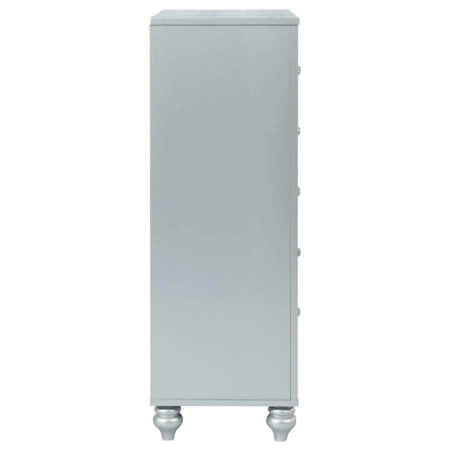 Enhance your home with a modern glam update to a classic design with this transitional five-drawer chest. It boasts a dazzling design that takes lends glitz to any modern bedroom. It comes in a vibrant silver metallic finish with fret work detail on the front panels and drawer fronts. The drawers are adorned with crystal-like pulls and the top ones are lined with black felt to protect treasured valuables. Delicate bun feet complete the design of this exquisite masterpiece.